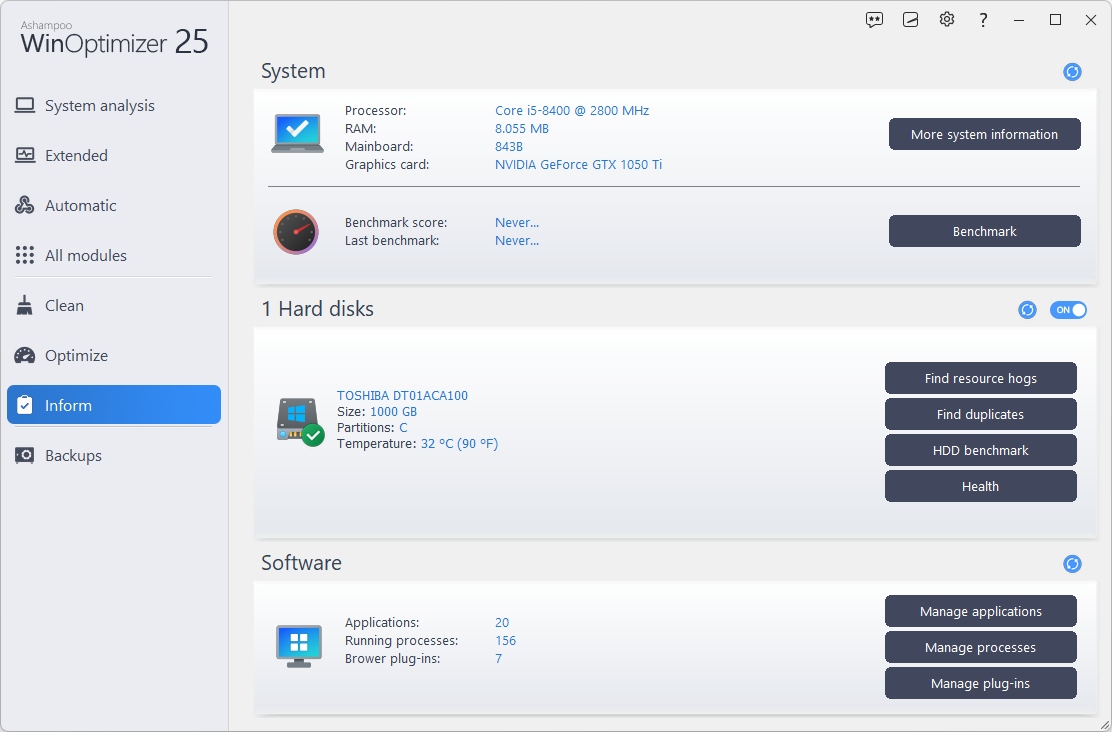 Ashampoo® WinOptimizer zapewnia rozszerzone spojrzenie na to co się dzieje w Twoim systemie, także w sterownikach. Gdy parametry systemu pogorszą się natychmiast uzyskasz powiadomienie, unikając awarii. Znajdź i wyeliminuj ograniczenia wydajności z łatwością. Dla szybkiego przeglądu zajrzyj do zakładki "Informuj". Dla dokładniejszych informacji, jak zainstalowany sprzęt, sterowniki i kodeki, zajrzyj do "Informacji systemowych".