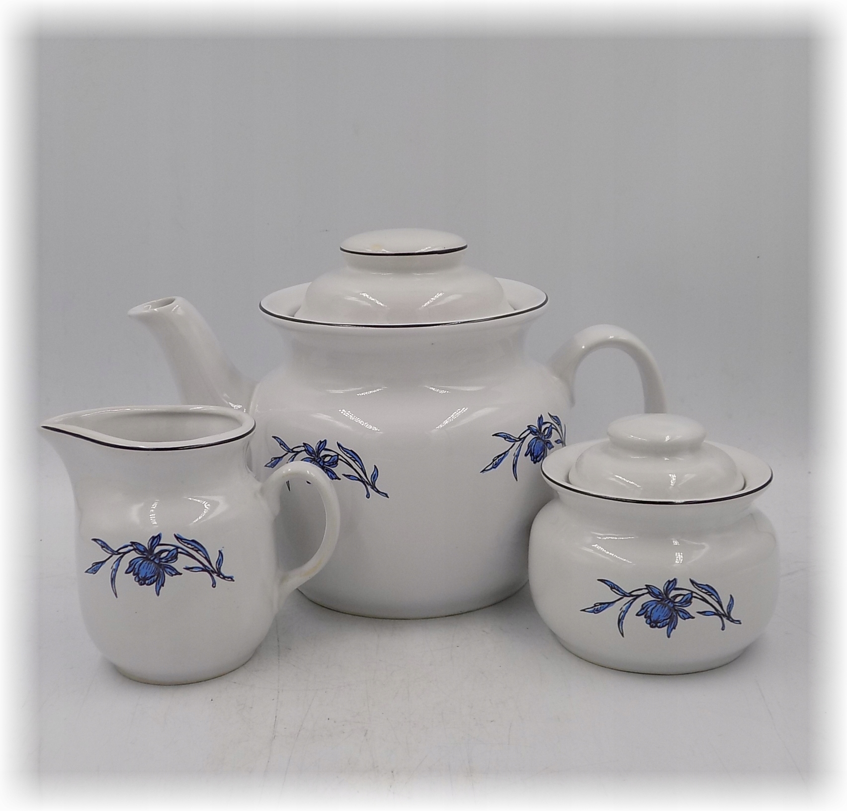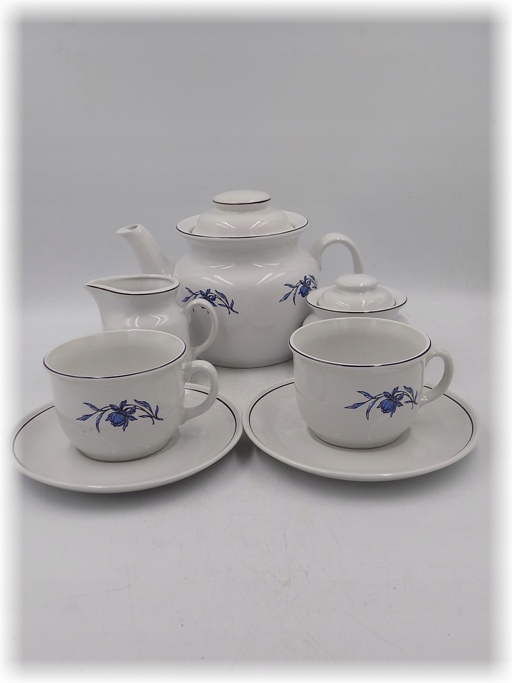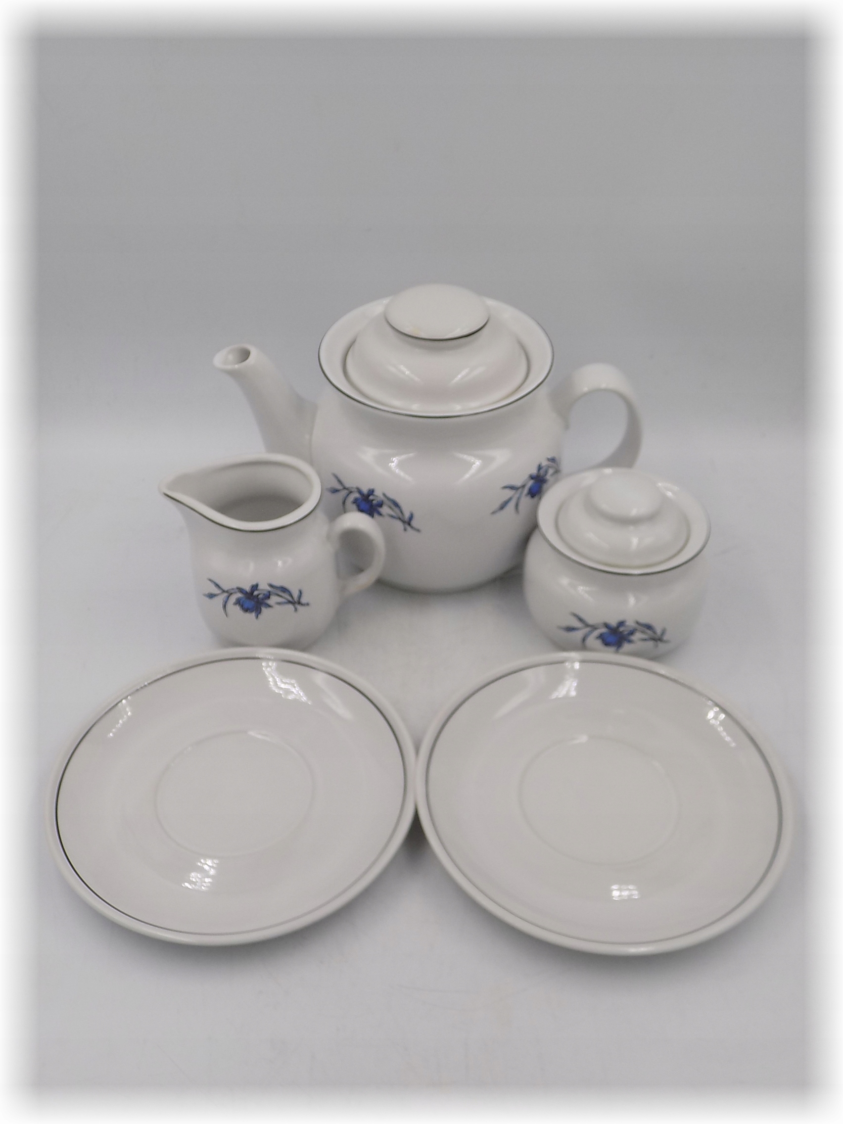 Кофейный сервис на 6 человек из столовой Porcelitu завода в Прушкове. Подпись используется с 1956 года года. Размеры; выс.6 х 9,5 см тарелка 16 см, молочник 9 см, сахарница 8 см, кувшин 15 см.