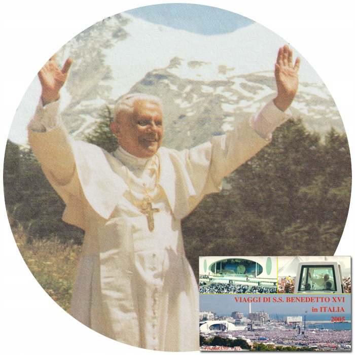 Kompletny zestaw trzech okolicznościowych kopert celebrujących podróże papieża Benedykta XVI do Włoch w 2005 roku: do Bari 29. marca na XXIV Kongres Eucharystyczny i do alpejskiej Doliny Aosty 16. lipca.