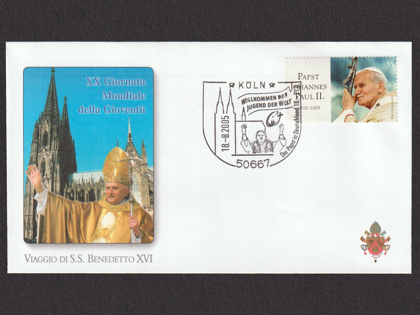 Na kopertach widnieją znaczki z Niemiec i Watykanu, a także okolicznościowe kasowniki na każde z kluczowych wydarzeń papieskiej wizyty.