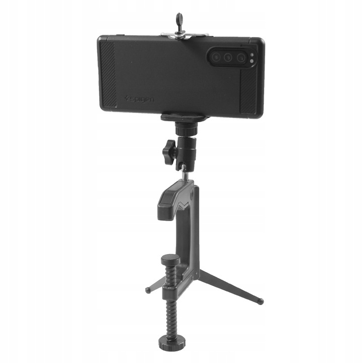 Uchwyt pozwala na zamocowanie statywu tak jak imadło, przykręcając go do brzegu stołu, blatu, półki, rury czy ogrodzenia. Można go również używać jak klasycznego statywu stołowego.