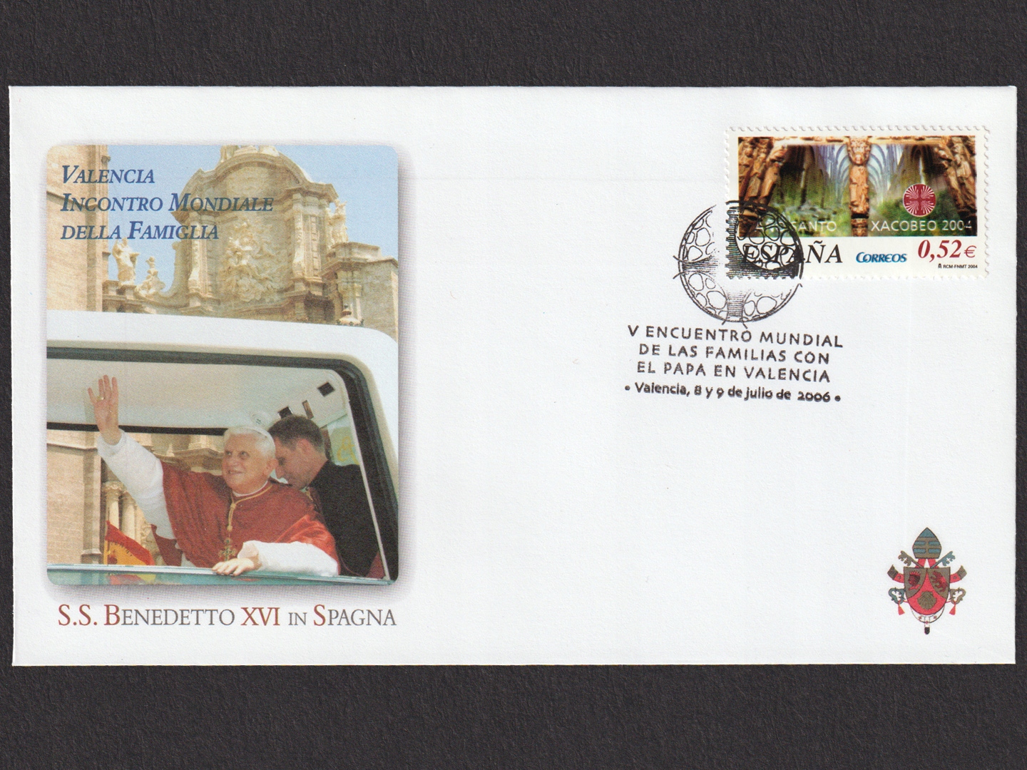 Pamiątkowy folder z kompletnym zestawem dwóch kopert okolicznościowych celebrujących podróż papieża Benedykta XVI do Hiszpanii pomiędzy 8. a 9. lipca 2006 roku, w tym wizytę na Światowym Spotkaniu Rodzin, które w 2006 roku odbyło się w Walencji.
