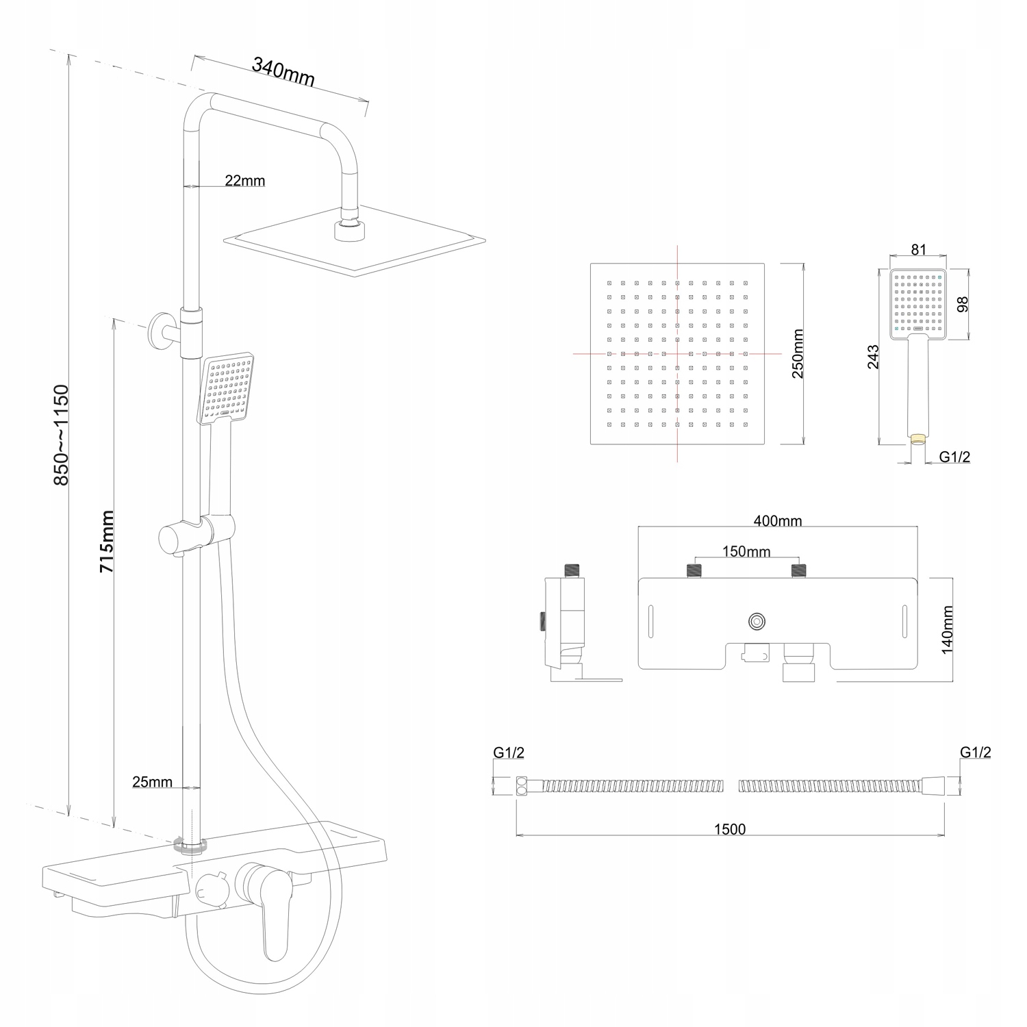 Rodzaj zestawu: Naścienny, dwuotworowy, jednouchwytowy, z przełącznikiem, z deszczownicą o wymiarach 25 x 25 cm i słuchawką prysznicową