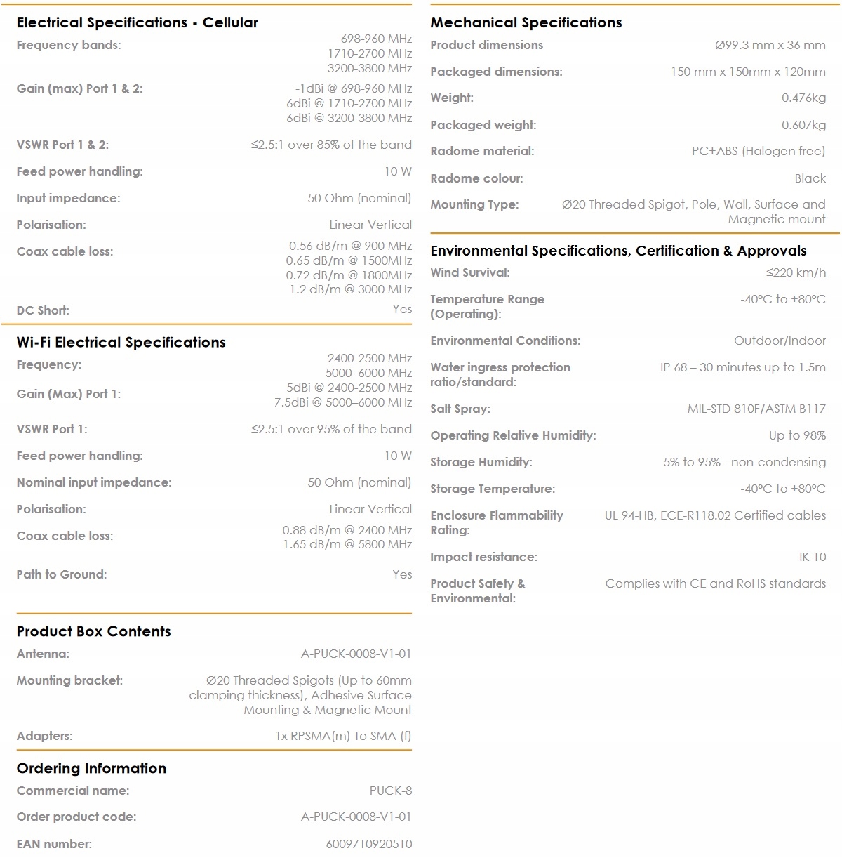 Nowa seria PUCK firmy Poynting oferuje małe anteny profilowe do użytku w IoT / M2M, inteligentnych licznikach, inteligentnych usługach użyteczności publicznej, transporcie, żegludze morskiej i rolnictwie. PUCK-8 składa się z systemu antenowego 3 w 1 w jednej obudowie, wyposażonego w 2×2 MIMO LTE i Wi-Fi (dwuzakresowe 2,4 GHz i 5 GHz). Anteny 2x Cellular MIMO (dla 2G / 3G / 4G) obsługują pasmo od 698 MHz do 3800 MHz, w tym najpopularniejsze międzynarodowe pasma LTE. Antena zapewnia dwuzakresową antenę Wi-Fi oferującą jednoczesne pasma 2,4 i 5 GHz, obsługującą standard 802.11ni 802.11ac / ax. PUCK przewyższa wydajność wielu konkurentów dzięki dbałości o projekt tej wysokowydajnej anteny. Wzorce promieniowania wszystkich elementów promieniujących zapewniają doskonałą równowagę między dookólnością, różnorodnością wzorów i dobrymi zdolnościami promieniowania na żądanej wysokości, co jest często pomijane w antenach o tak małych rozmiarach. Pomimo niewielkich rozmiarów antena ta zapewnia doskonałą wydajność, szczególnie w wyższych pasmach częstotliwości, gdzie wydajność ma kluczowe znaczenie dla przepustowości LTE i stabilności połączenia. Ta antena została zaprojektowana tak, aby oba porty LTE były podłączone do routera / urządzenia, aby zapewnić najlepszą wydajność. Zapoznaj się z innymi pochodnymi serii PUCK, które są bardziej odpowiednie do zastosowań SISO.