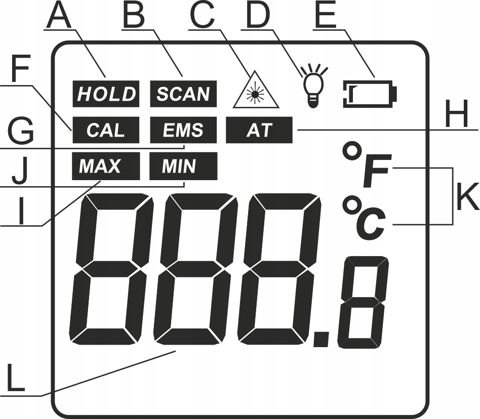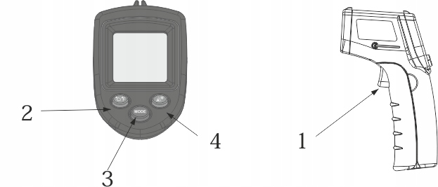 (1) Spust: naciśnij w celu rozpoczęcia pomiaru (na ekranie pojawi się ikona SCAN. Zwolnij spust, aby zatrzymać pomiar zachowując ostatnio zmierzoną wartość pomiaru. Urządzenie wyłączy się automatycznie jeżeli nie będzie wykonywana żadna operacja.