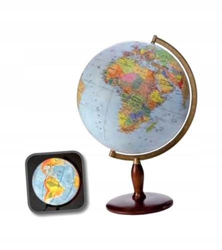 Globus 420 mm podświetlany, mapa polityczno-fizyczna 2w1, drewniana niska stopka, cięciwa aluminiowa.