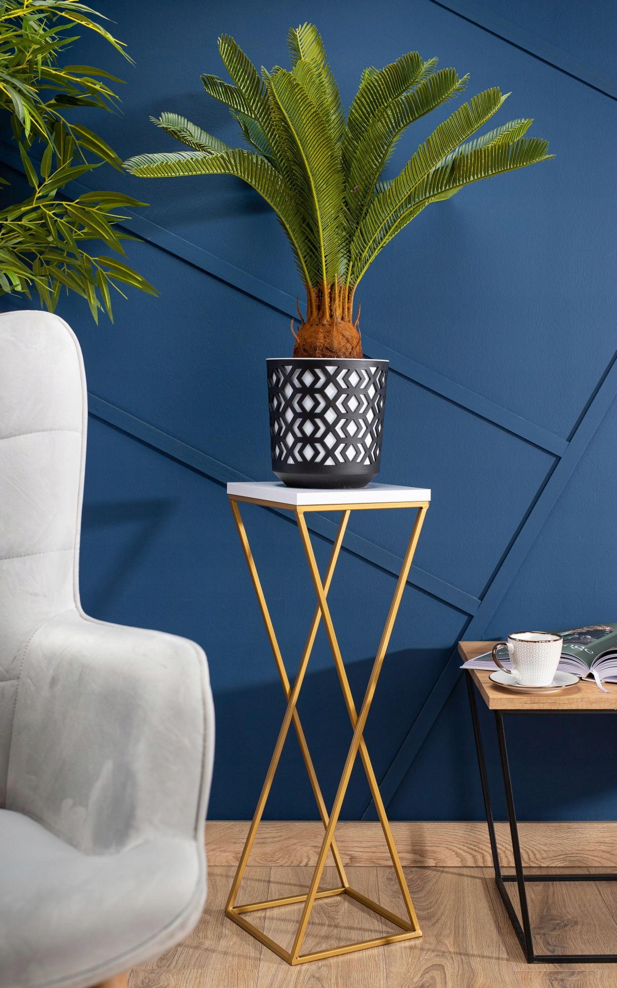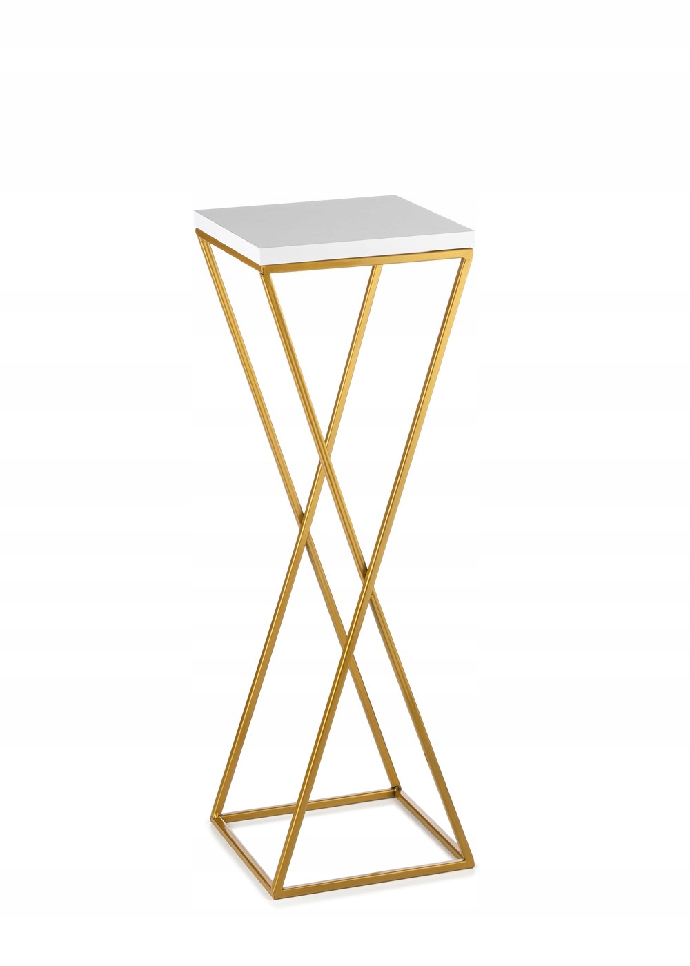 Nowoczesny kwietnik stojący w stylu loftowym. Kwietnik wykonany z połączenia metalu i płyty MDF to solidny i niezwykle stylowy element wystroju pomieszczeń. Stabilność i wytrzymałość idealnie sprawdzi się do eksponowania ulubionych roślin doniczkowych. Jego solidna konstrukcja zapewnia bezpieczne miejsce dla Twoich kwiatów lub ziół, jednocześnie tworząc minimalistyczny, nowoczesny wygląd, który doskonale współgra z wieloma stylami aranżacyjnymi. Metalowa ramka nadaje mu nowoczesnego charakteru, podczas gdy płyta MDF dodaje mu elegancji i finezji. Prezentowany kwietnik jest w kolorze złotym oraz białym blatem MDF.