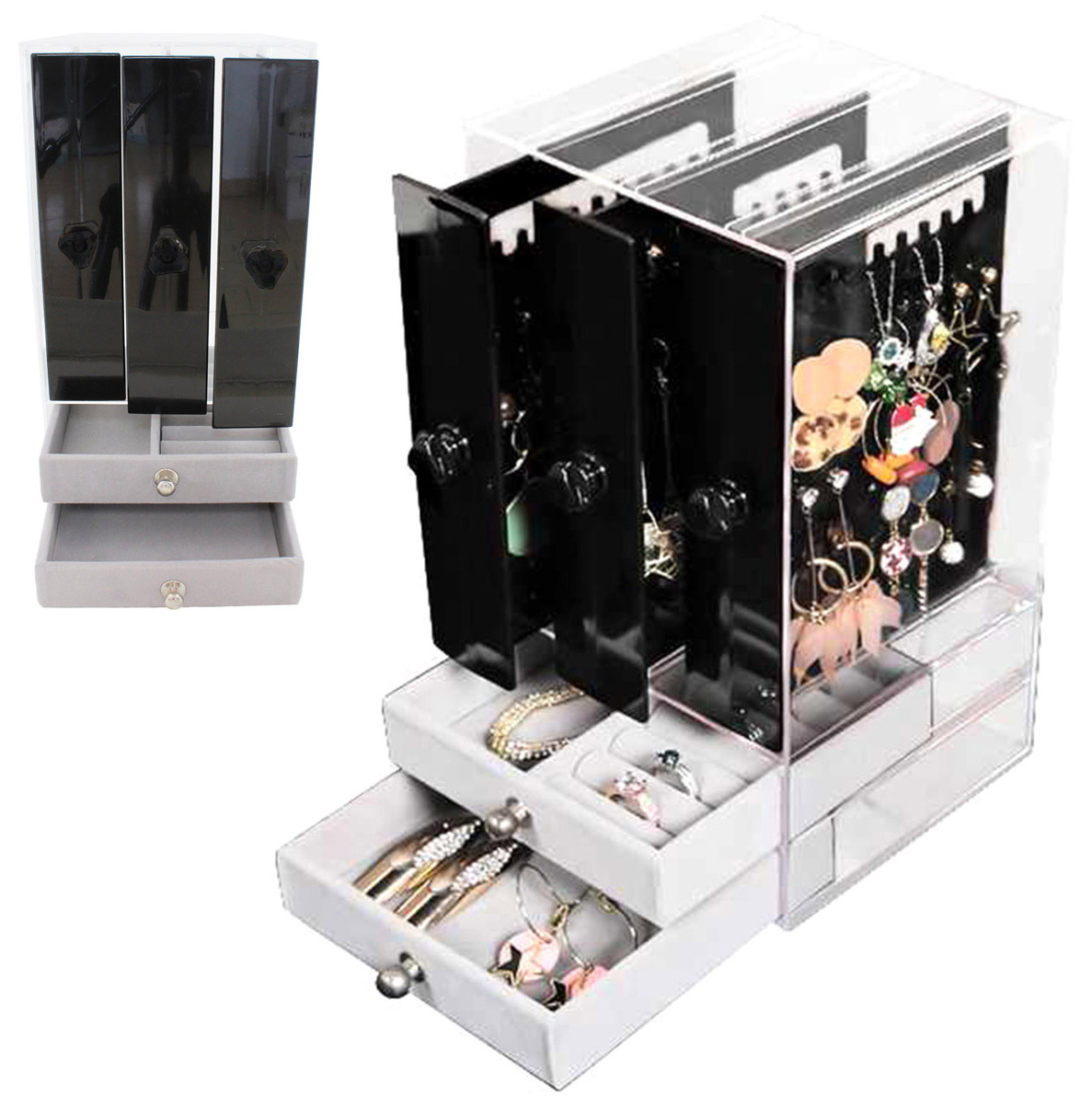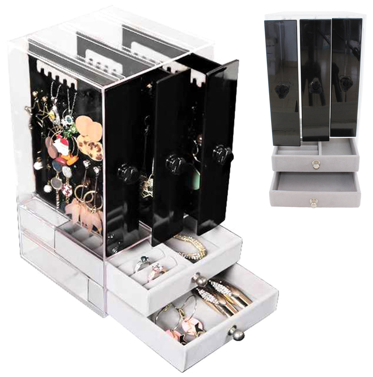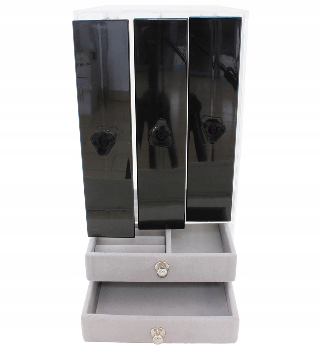 Практичный органайзер для ювелирных изделий с тремя выдвижными ящиками для подвешивания браслеты или серьги в вертикальном положении. Он также имеет два дополнительных ящика в нижней части. Витрина, необходимая каждой женщине, которая хочет навести порядок в своих коллекциях браслетов, часы и другие украшения и выставить их в эстетической форме. Он также отлично подойдет на любых выставках и витринах магазинов, у ювелира или в ломбарде.