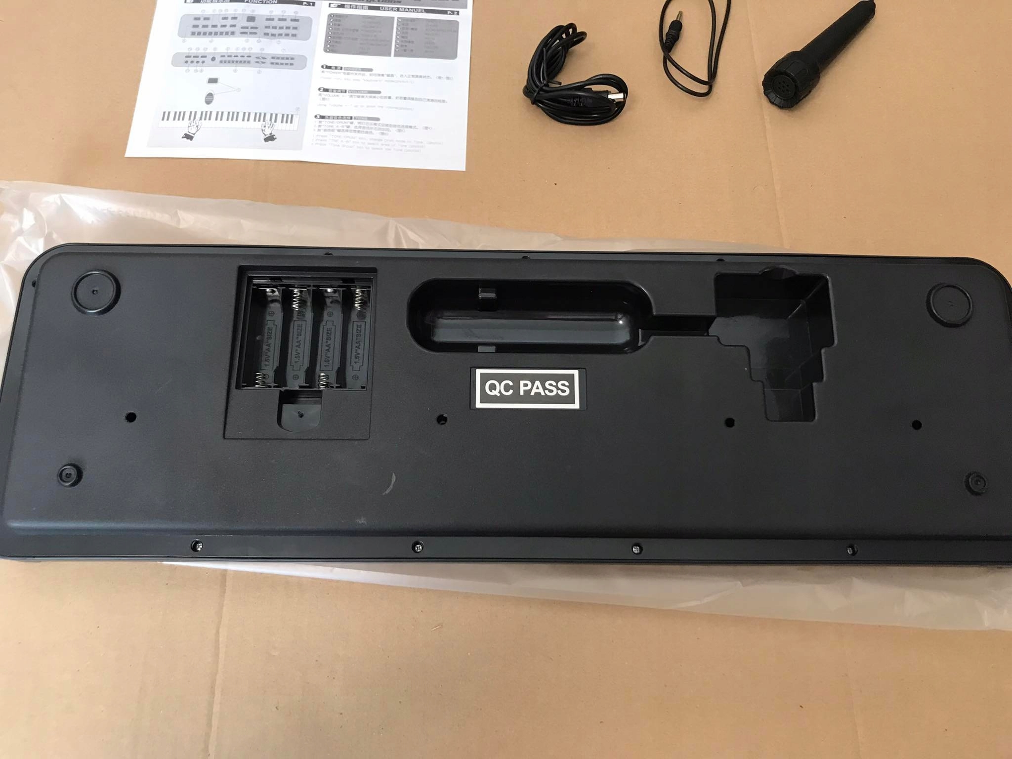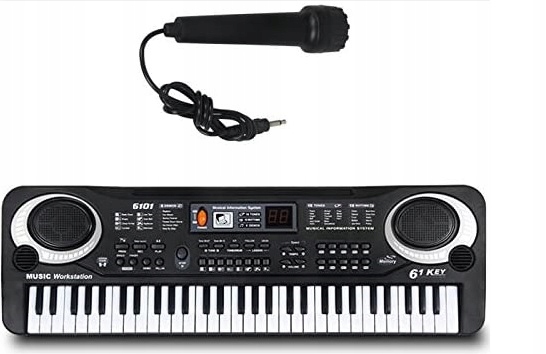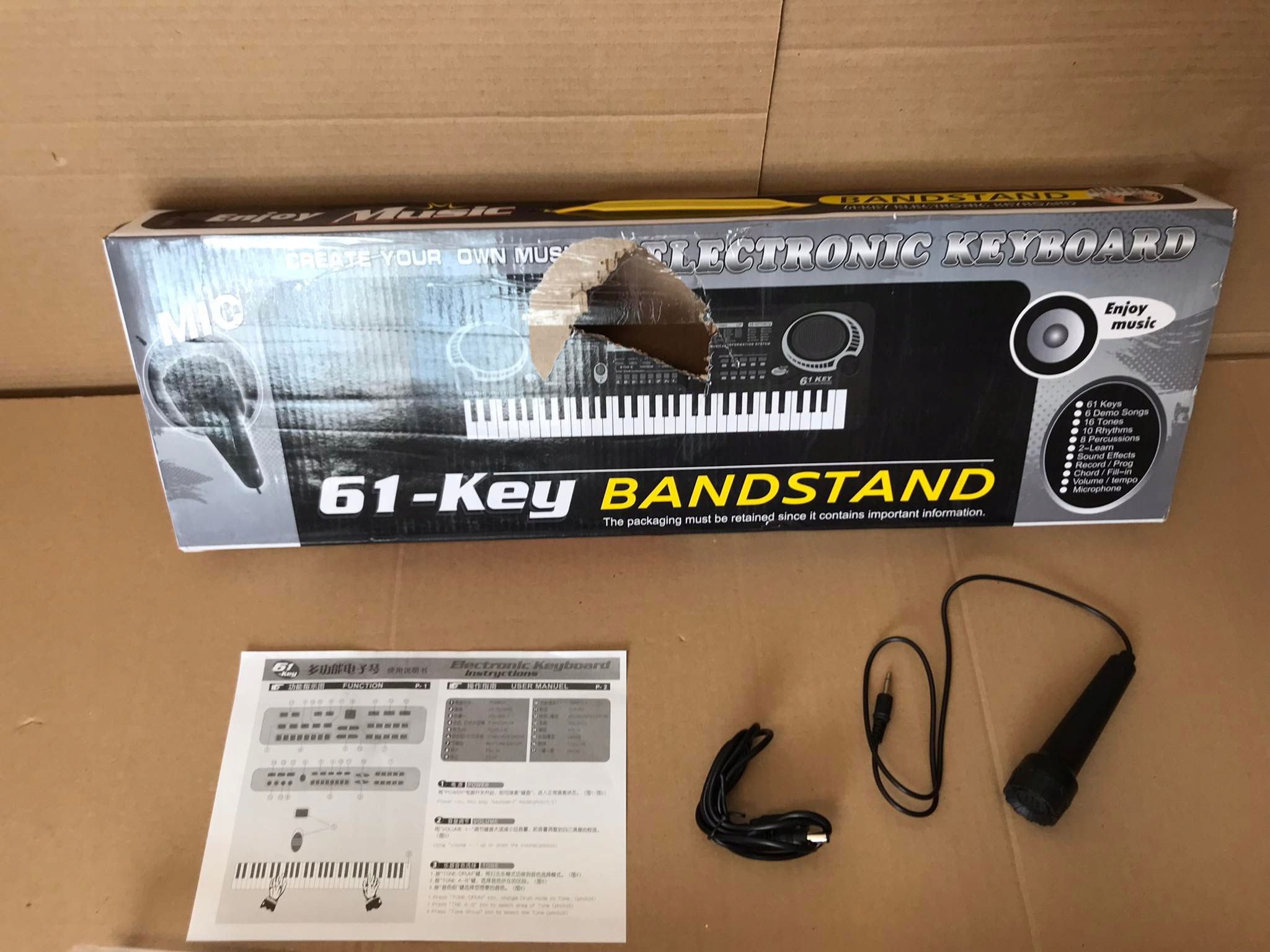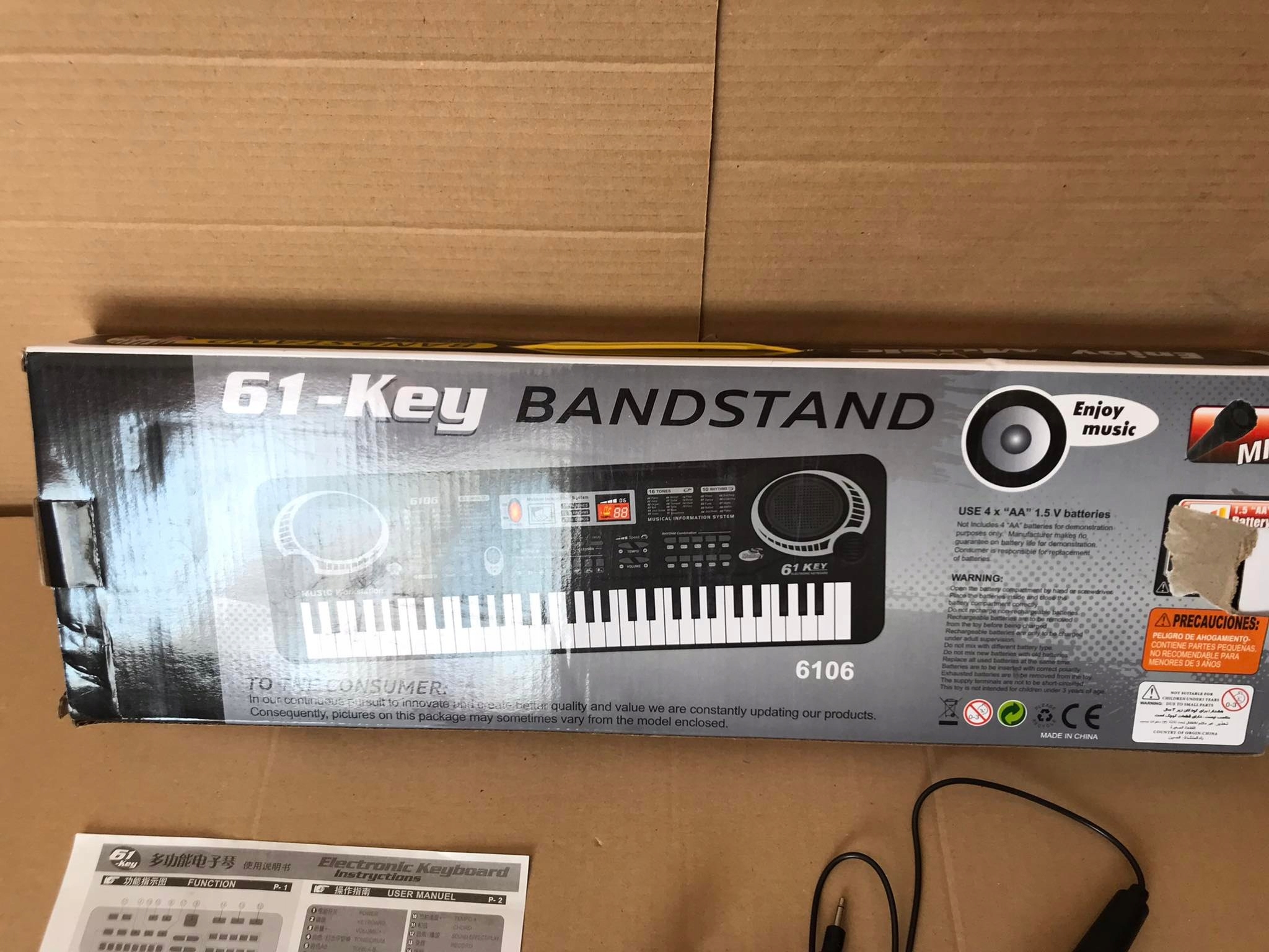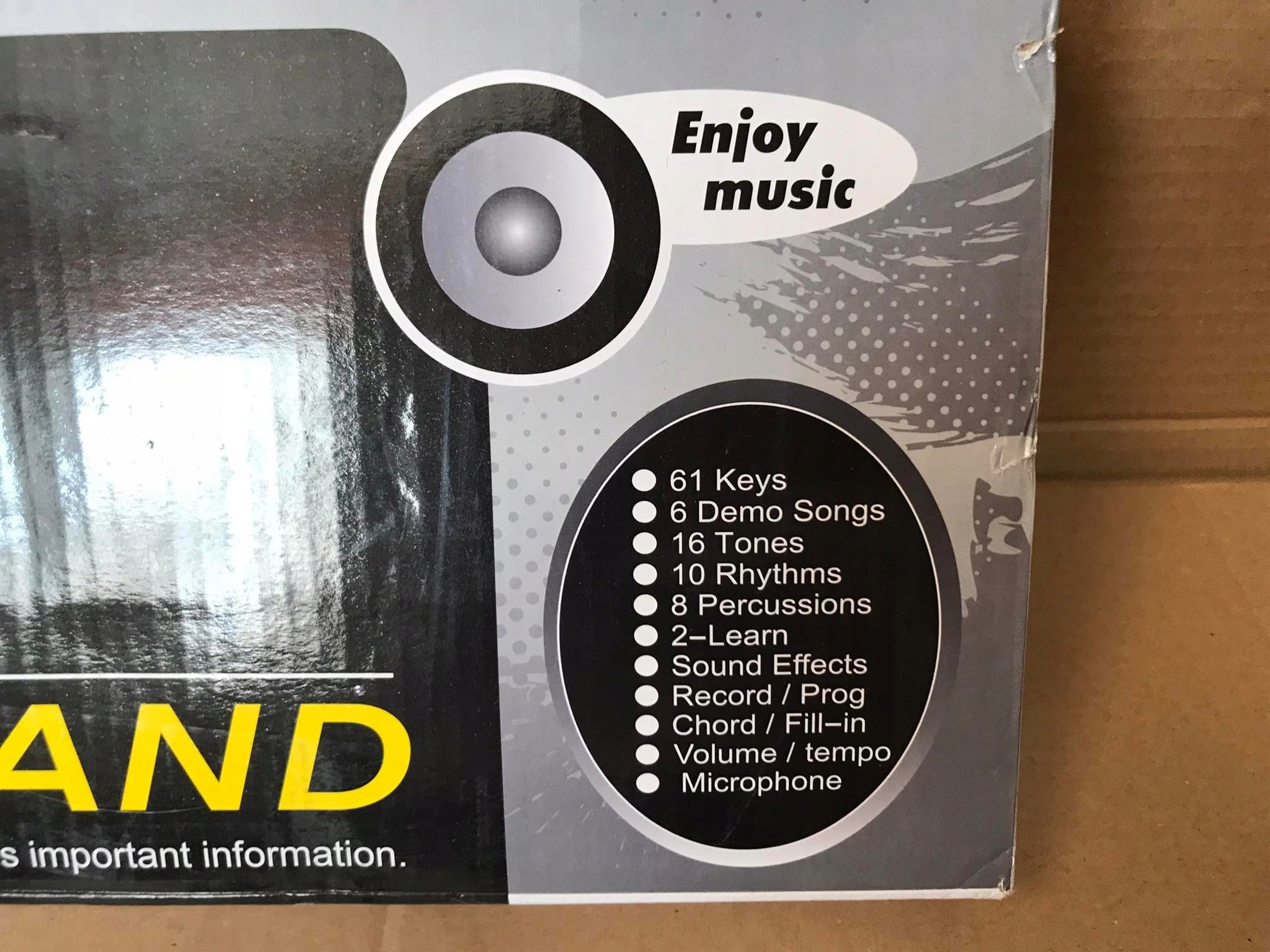 W KEYBOARDZIE DZIAŁA JEDEN Z DWÓCH GŁOŚNIKÓW ( pomimo tego urządzenie gra głośno). Produkt posiada ryski pod spodem. Pierwsze zdjęcie jest poglądowe, natomiast wszystkie pozostałe fotografie przedstawiają rzeczywisty wygląd i zawartość oferowanego zestawu. Baterie 4 x AA nie wchodzą w skład zestawu. Opakowanie podniszczone również widoczne na zdjęciach.