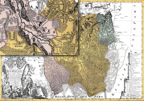 Tabl. 21 - (1752) 1736 Johann Wolfgang Wieland--Principatus Silesiae Teschinensis nova et accurata Delineatio distincte insimul exhibens status minores vulgo Burglehn dictos, Freystadt, Roy, Reich Waldav, Bielitz, Friedeck, Deutschleuthen et Oderberg. Ex mensurationibus I.W. Wielandii locumtenentis caesarei reducta sumptibus principum et Ord Silesiae A.O.R. MDCCXXXVI Excusa Norimb. ab Homannianis Heredibus. [ok. 1:124 000]