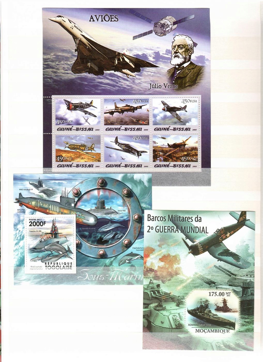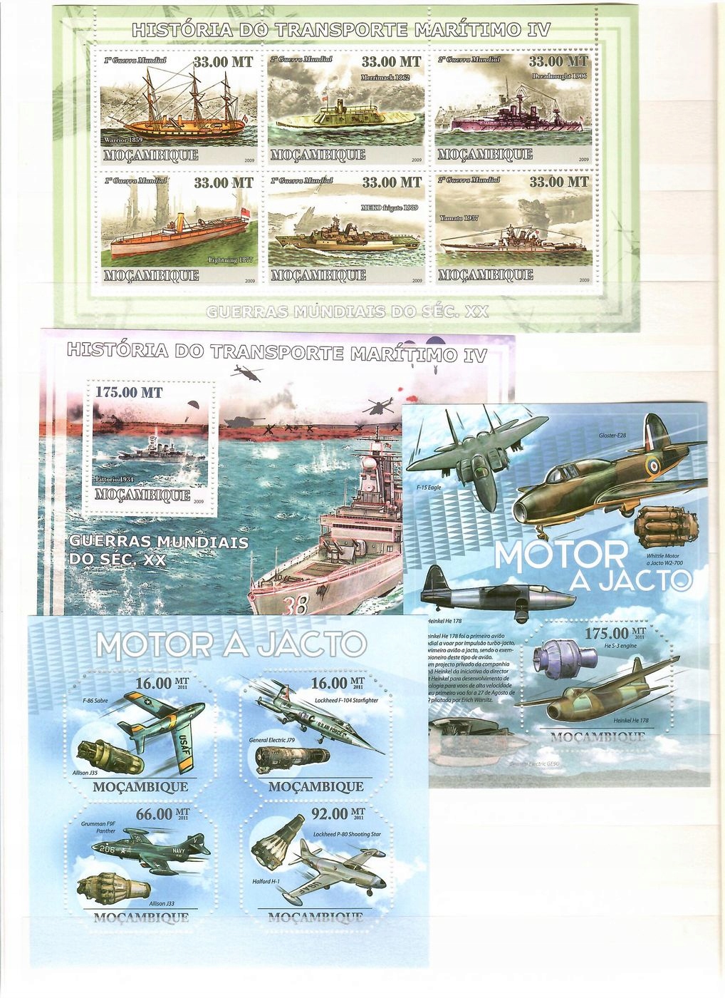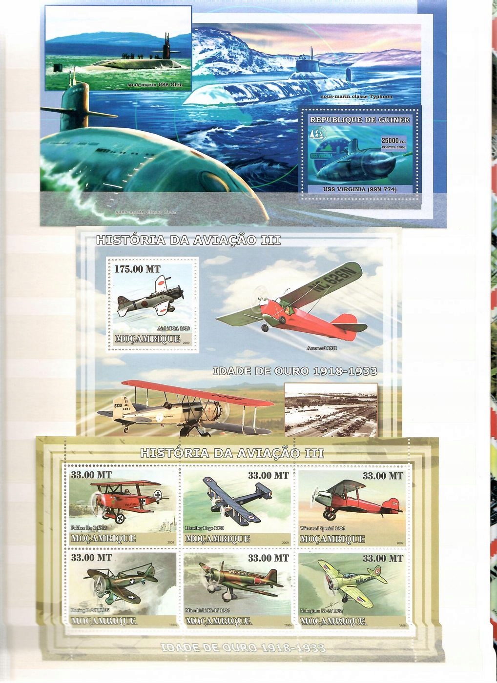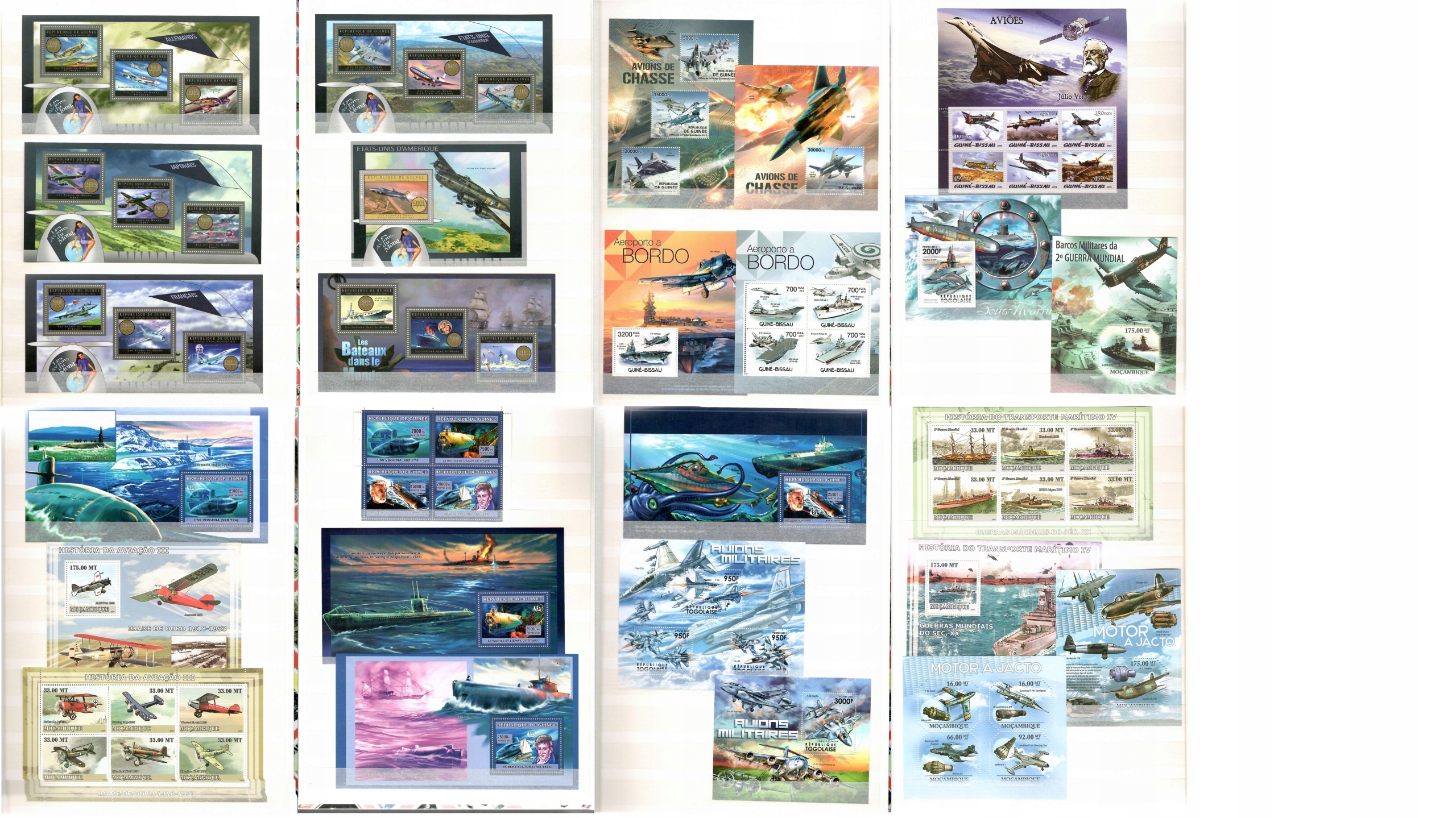 Kolekcja znaczków pocztowych o tematyce wojskowej. Znaczki poświęcone głównie technice wojskowej (samoloty, okręty podwodne, lotniskowce). W kolekcji 26 sztuk serii w formie okolicznościowych arkusików lub bloków. Wartość katalogowa 311 euro według katalogu Michel. Wszystkie znaczki czyste (niestemplowane). Stan znaczków idealny.