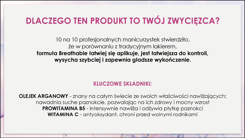 Первый в истории профессиональный продукт all-in-one, сочетающий препарат с цветом. В отличие для традиционного лака для ногтей, Orly Breathable, с Формулой Advanced Oxygen Technology он создает проницаемый слой на ногтях, который позволяет кислороду и воде проникать через пластину к плаценте.