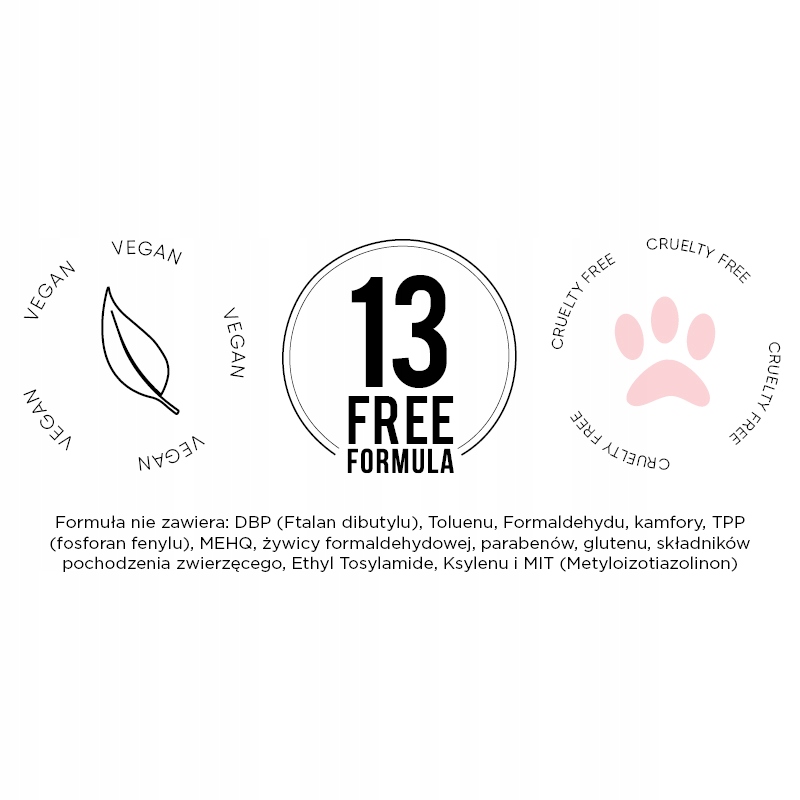 Формула 13 FREE не содержит вредных ингредиентов, таких как: DBP (Дибутилфталат), толуол, формальдегид, камфора, TPP (фенилфосфат), MEHQ, смола формальдегид, парабены, глютен, ингредиенты животного происхождения, этил Тозиламид, ксилол i MIT(Metyloizotiazolinon).