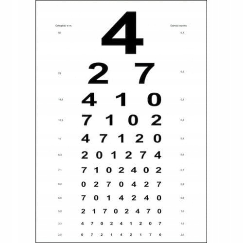 Картонная оптометрическая доска. С печатным цифровым оптотипом используется в исследованиях острота зрения. Пациент закрывает один глаз и последовательно читает цифры в рядах, начиная с Всевышнего. Наименьший ряд, который может прочитать пациент, указывает на остроту его зрения в данном глаз.