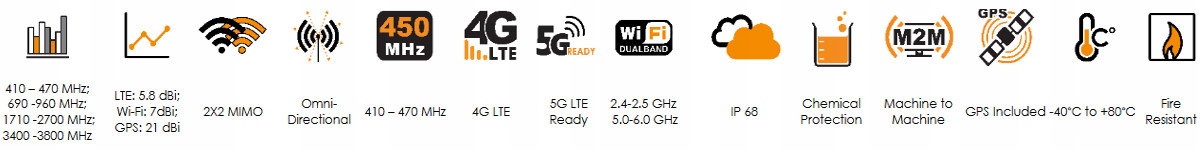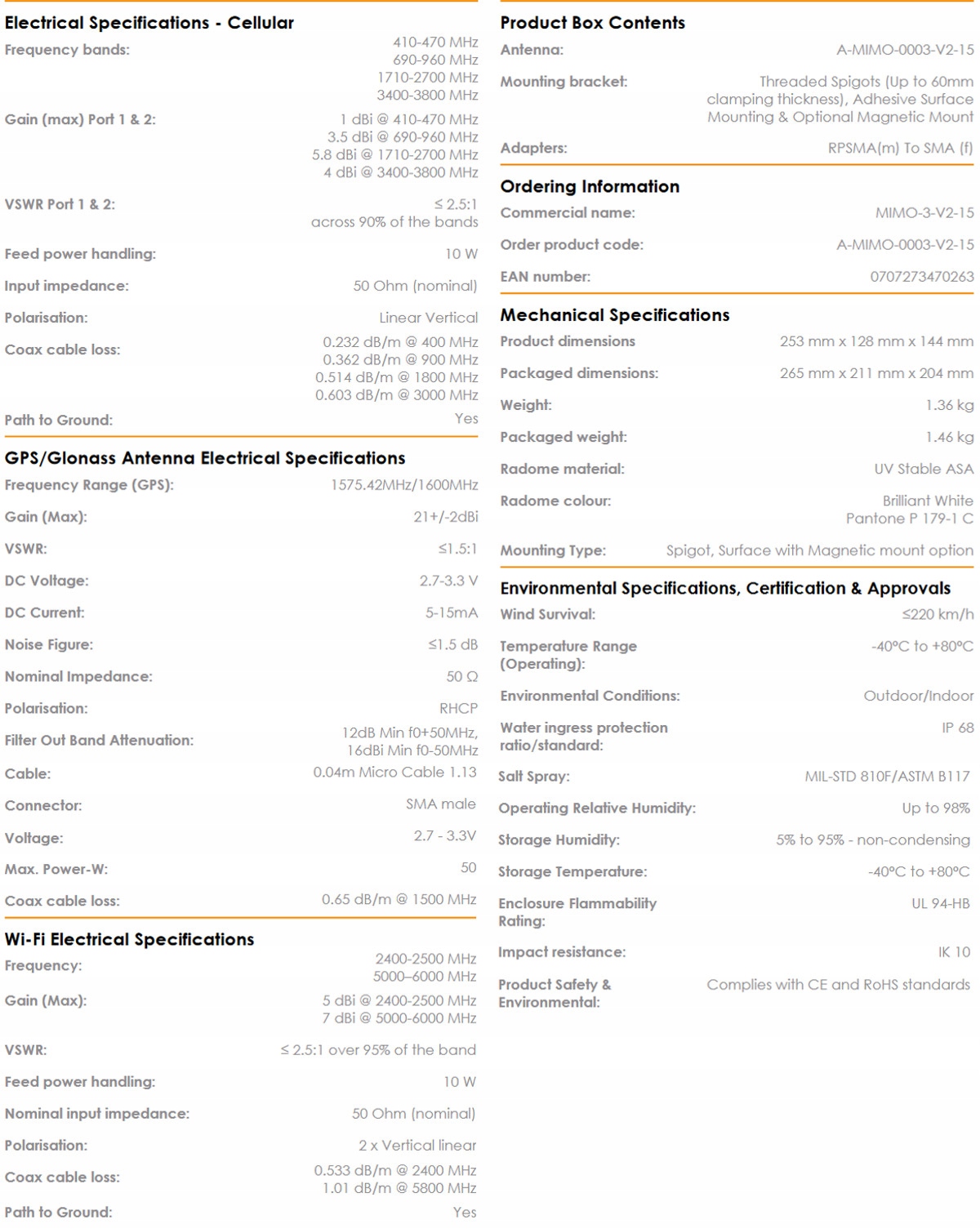 MIMO-3-15 to wysokowydajna antena wieloczęstotliwościowa 5w1, zapewniająca dwie anteny komórkowe, dwa Wi-Fi i antenę GPS / GLONASS. Dwie anteny komórkowe MIMO (dla 2G / 3G / 4G) obejmują współczesne pasma od 690 MHz do 2700 MHz, a także nowe pojawiające się widmo LTE i 5G dla pasm 450 MHz i 3,5 GHz CBRS, które stają się popularne wśród różnych międzynarodowych operatorów sieci komórkowych LTE. Ultraszerokopasmowa wydajność anteny pozwala na użycie jej przez różnych operatorów i różne technologie i jest gotowa na przyszłe technologie komórkowe do 3,8 GHz dla aplikacji 5G. Antena zapewnia dwie oddzielne dwupasmowe anteny Wi-Fi, zapewniając jednocześnie 2,4 GHz i 5 GHz na każdej antenie z funkcją 2x2 MIMO. Piąta antena to wysokowydajny, aktywny system GPS / GLONASS działający do -40 ° C. MIMO-3-15 przewyższa wydajność większości konkurentów dzięki dbałości o projekt tej wysokowydajnej anteny. Wzorce promieniowania wszystkich elementów promieniujących zapewniają doskonałą równowagę między wielokierunkowością, różnorodnością wzorów i dobrymi zdolnościami promieniowania na żądanej wysokości. Jest to ważne kryterium dla rynku transportowego i morskiego. dla którego antena została specjalnie zaprojektowana. Główne zastosowania to pojazdy komercyjne / przemysłowe, morskie, M2M i inne systemy IoT wykorzystujące szeroką gamę technologii radiowych, zachowując przy tym przyszłość w szerokim paśmie częstotliwości.