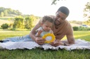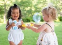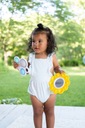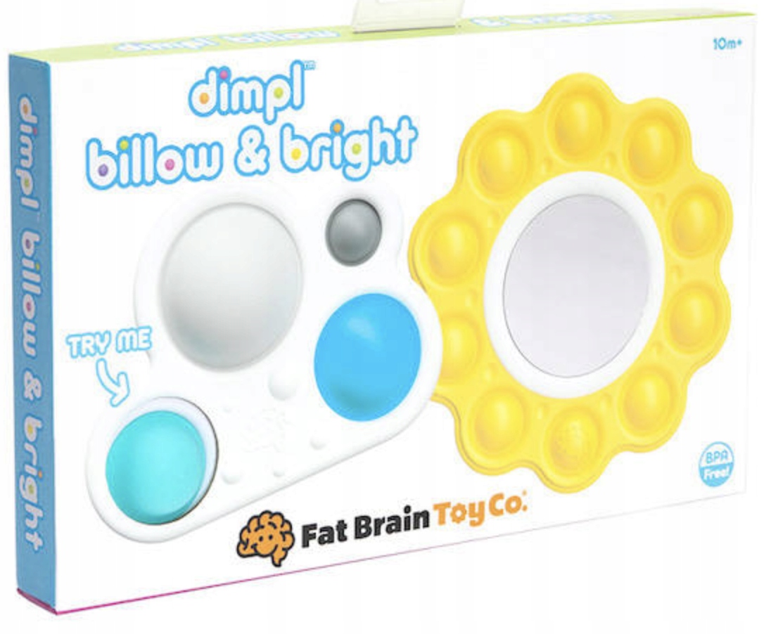 Zestaw bąbelków zawiera Dimpl Słoneczko i Dimpl Chmurkę. Żółte, okrągłe słoneczko ma w środku wbudowane dwustronne, bezpieczne lusterko, które będzie fascynować i stymulować malucha.