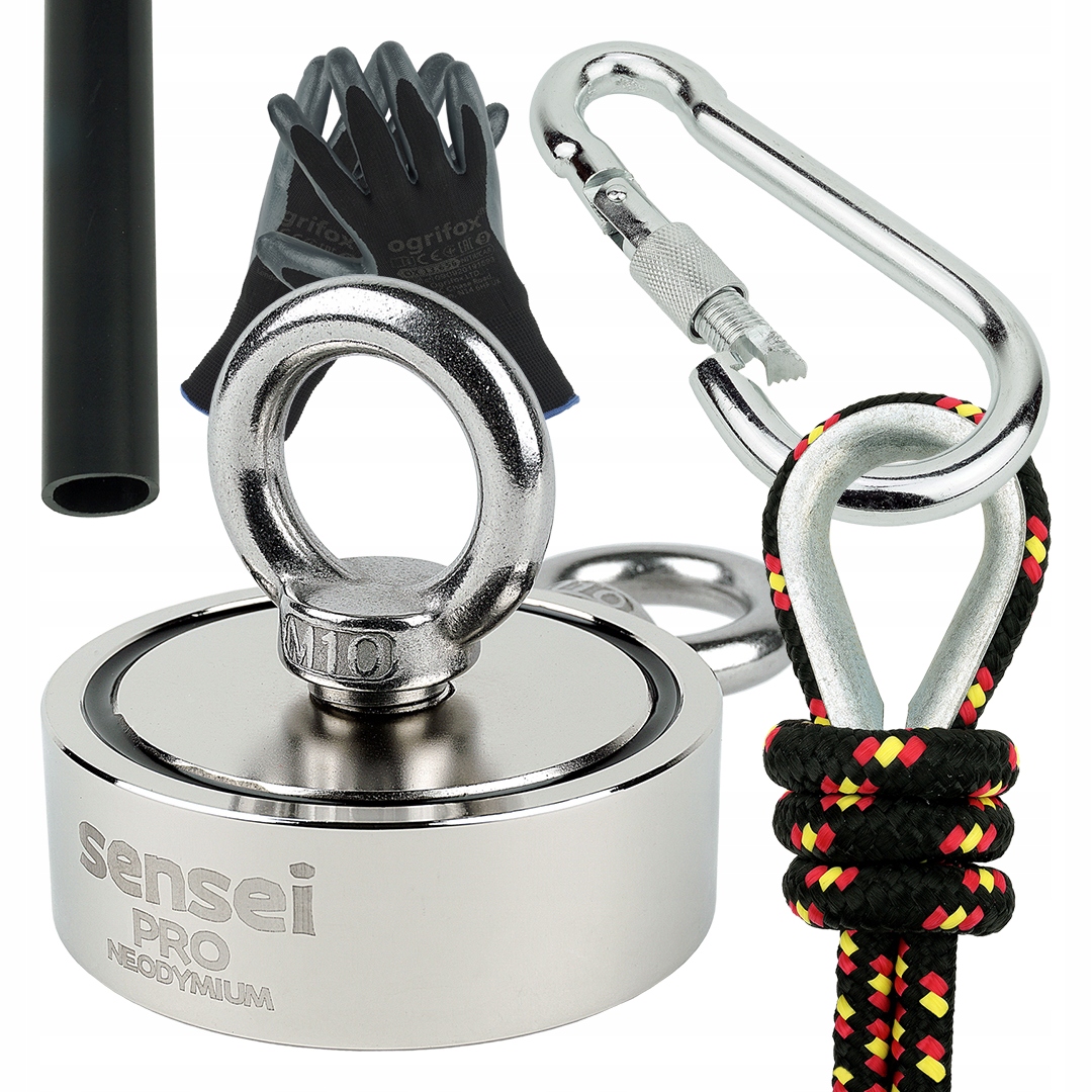 Zestawy Sensei zostały rozbudowane o komplet akcesoriów dodatkowych. Oprócz liny oraz rękawic, dokładamy kauszę, karabińczyk z zabezpieczeniem przed odpięciem oraz rurkę termokurczliwą z klejem. Wszystkie akcesoria dopasowane są swoim rozmiarem oraz wytrzymałością do liny oraz udźwigu maksymalnego magnesu.