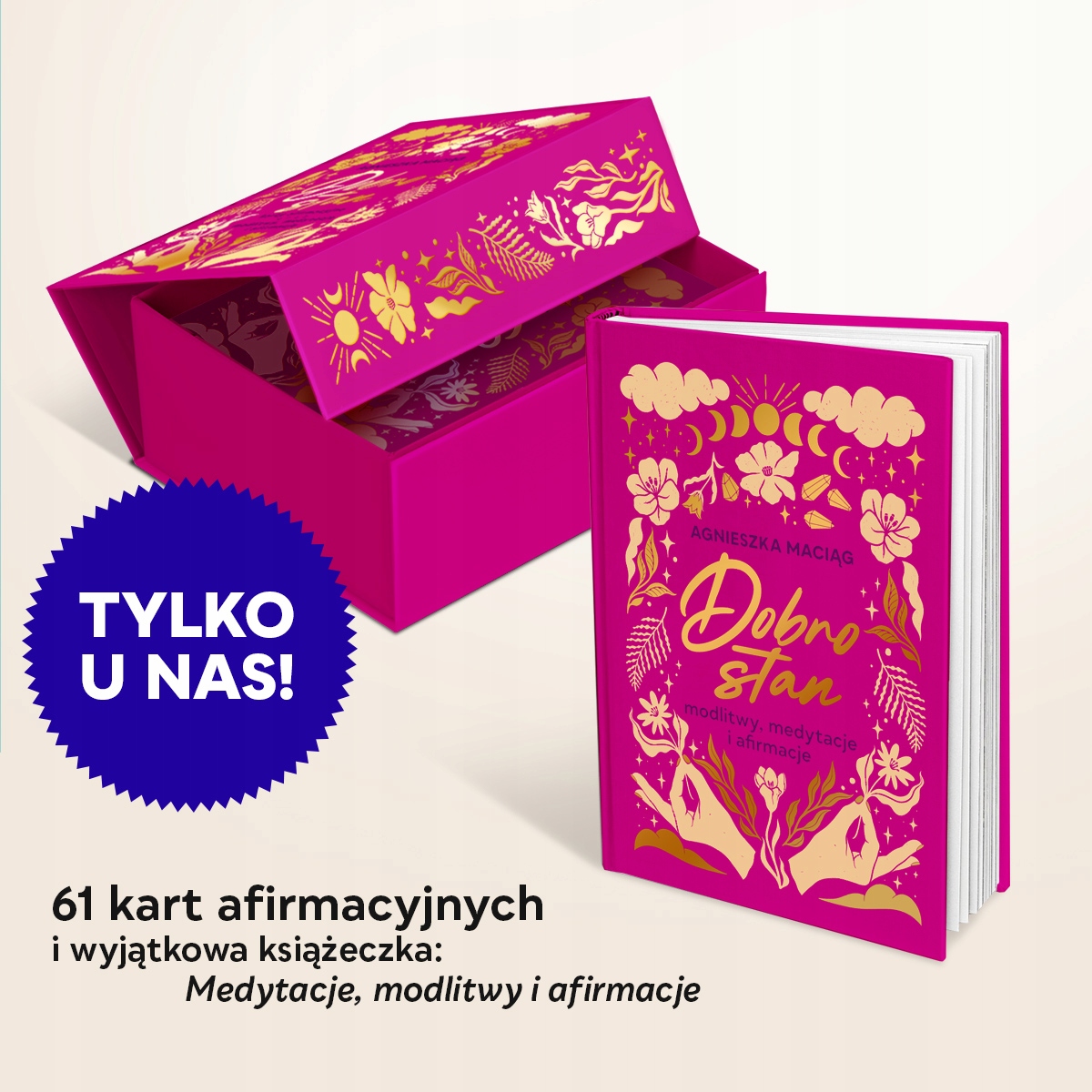 W pudełku znajdziesz 61 kart z krótkimi afirmacjami, które będą towarzyszyć Ci każdego dnia, oraz wyjątkową książeczkę zawierającą dłuższe afirmacje, medytacje i modlitwy.