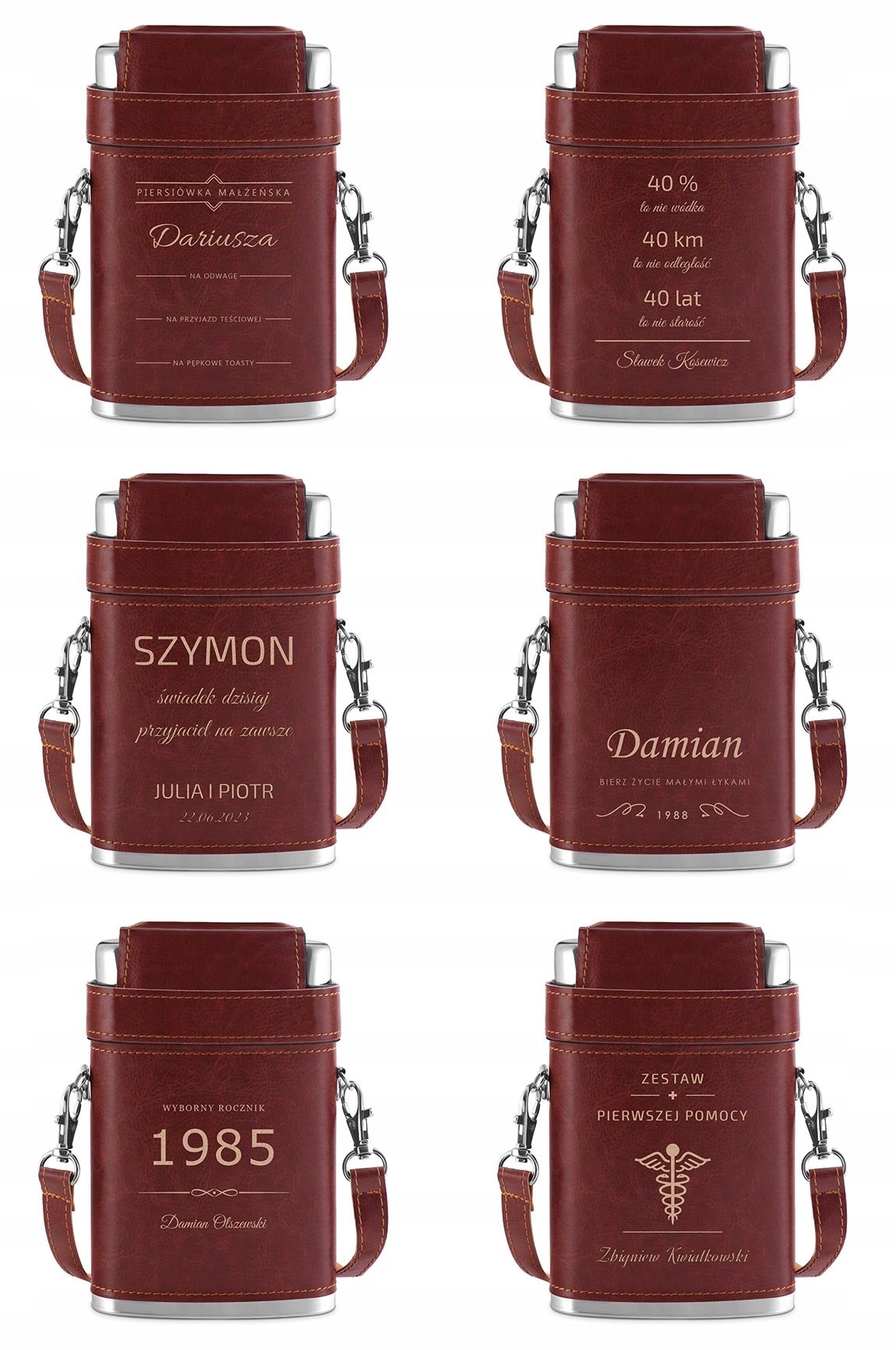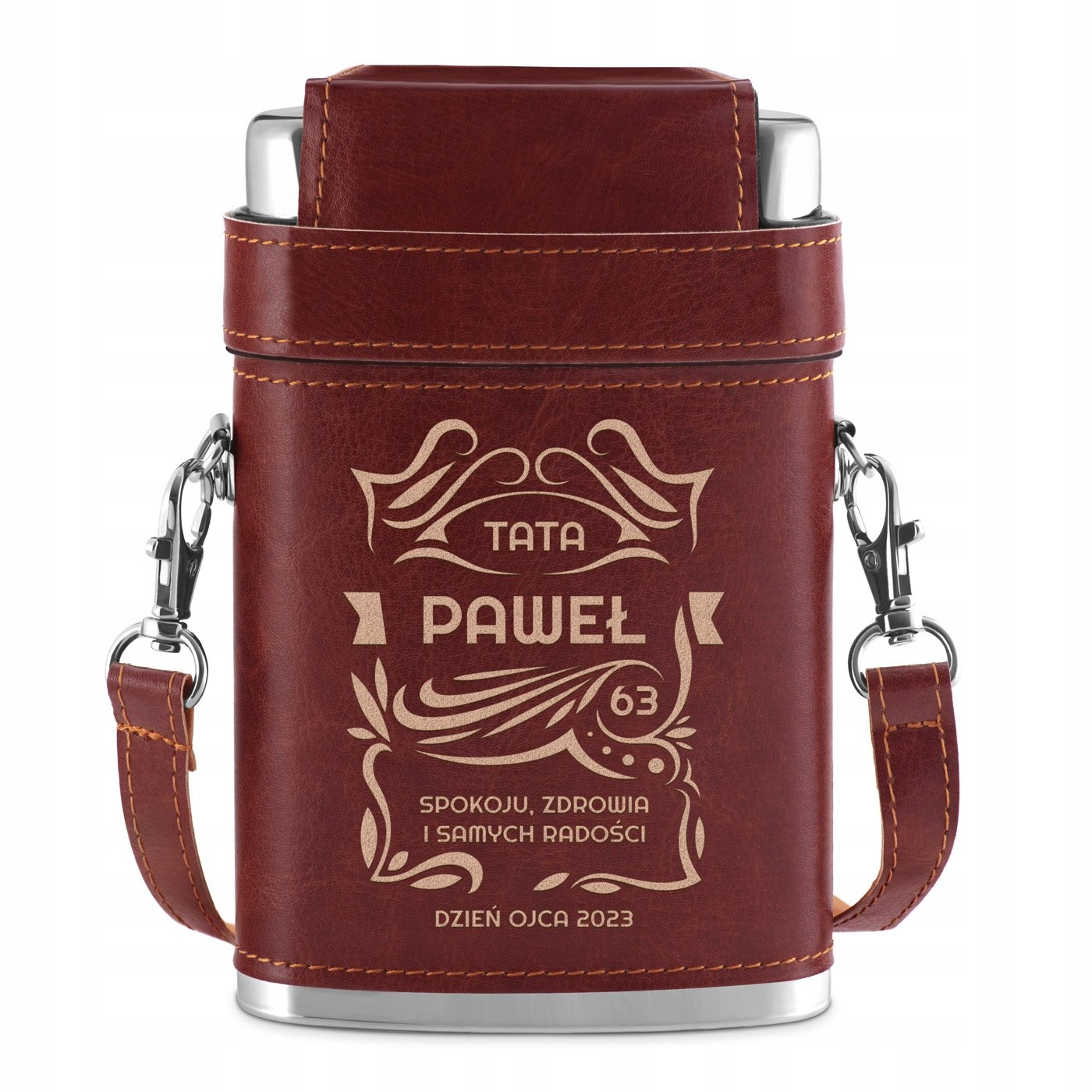 Zastanawiasz nad upominkiem dla plenerowego konesera wyjątkowych trunków? Mamy to! Proponujemy wysokiej jakości stalową piersiówkę. W komplecie znajdują się trzy kieliszki wykonane ze szczotkowanej stali. Całość została połączona w skórzanym etui na pasku. Brązowa skóra oraz wysokiej jakości stal podkreśla elegancki charakter upominku. Dodatkowo na etui możemy wykonać personalizowany grawerunek. Dzięki takiej dedykacji będzie to idealny prezent na każdą okazję.