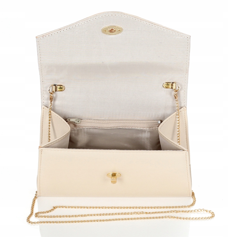 Wnętrze wykończone jest mocną podszewką kaletniczą. W środku znajduje się kieszonka zamykana na zamek. Złoty łańcuszek jest odpinany, można więc nosić torebkę w ręku.