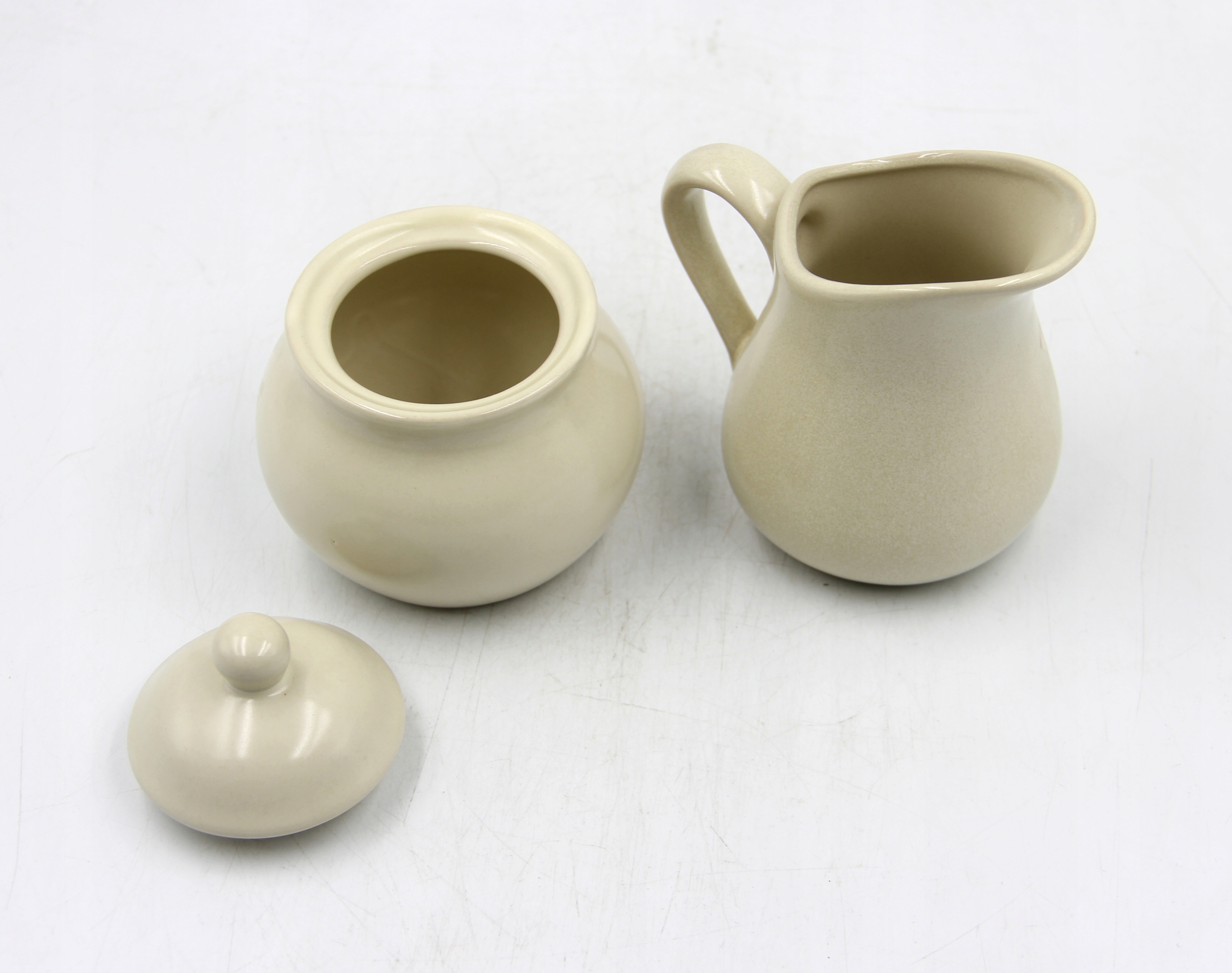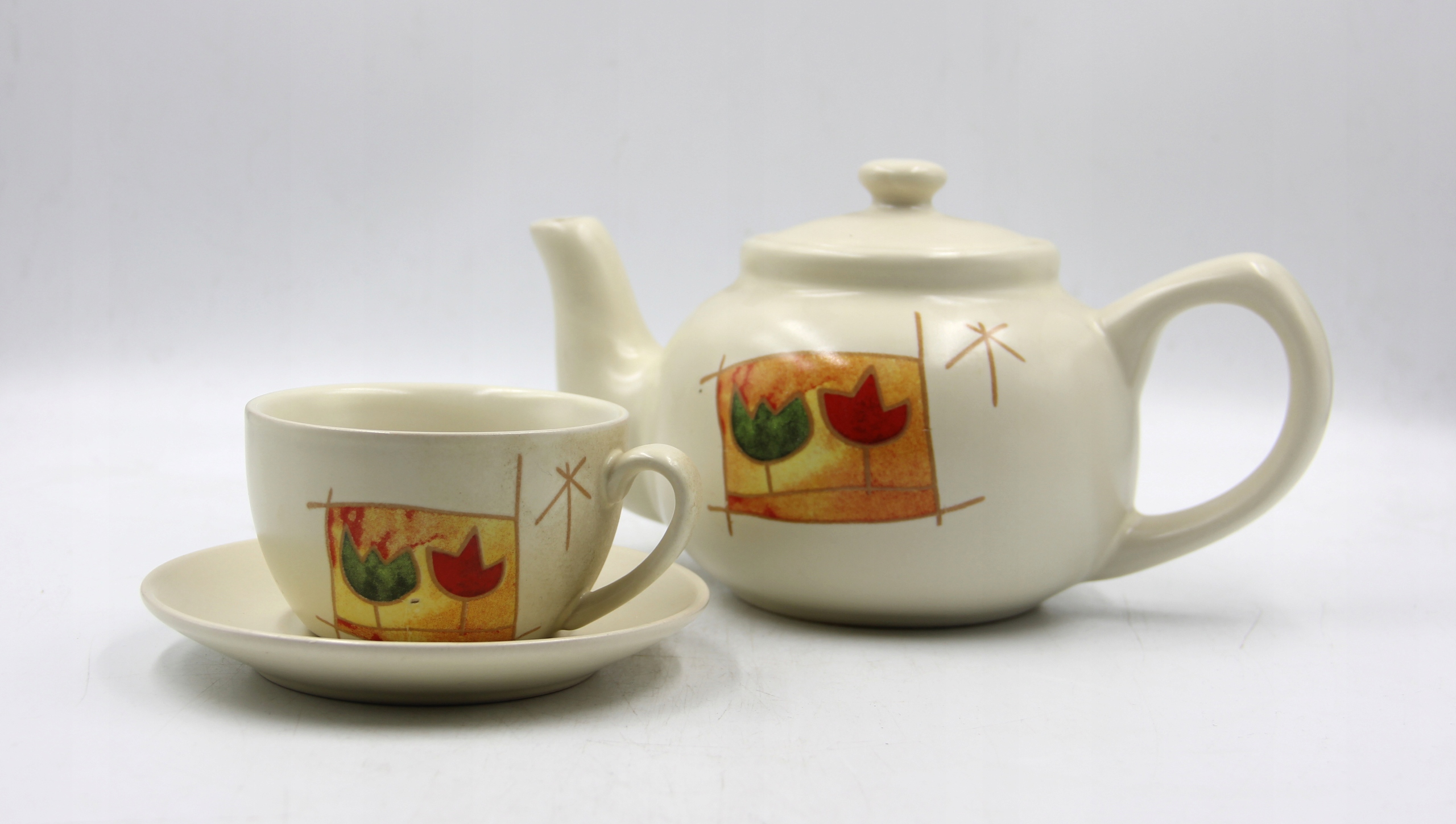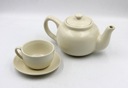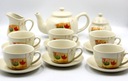 Serwis kawowy na 6 osób. Wymiary; dzbanek 11 cm, cukiernica 10 cm, mlecznik 10 cm, filiżanki wys.5 x 9 cm, talerzyk 13 cm. Drobne ślady użytkowania Polecam