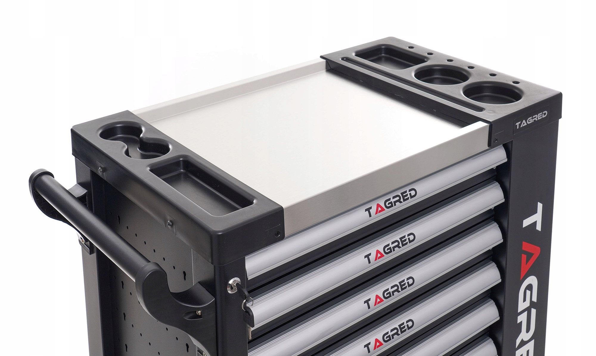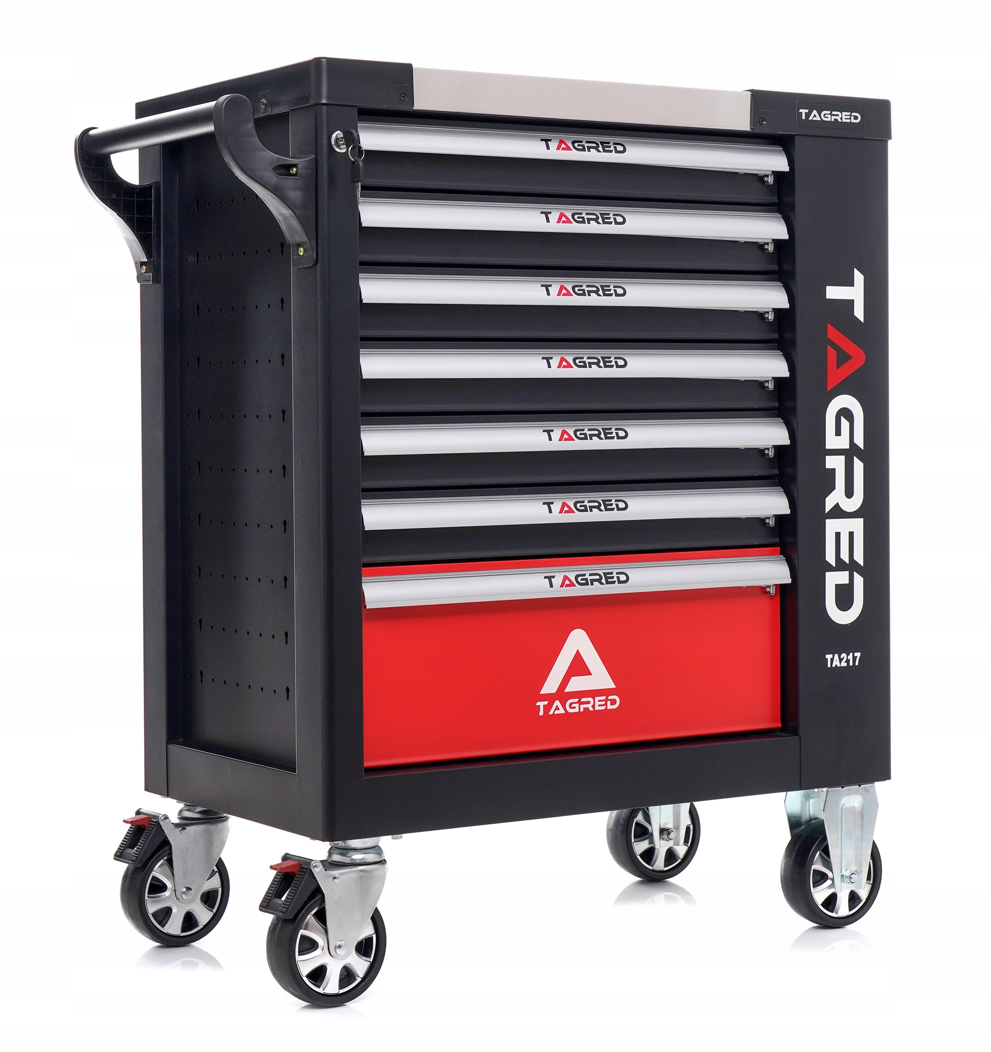 Это позволяет поддерживать порядок на рабочем месте, а также защищает инструменты от кражи (тележка запирается на ключ). Шкаф имеет стенкой, прочным крепится, для легкой транспортировки. полностью выдвижные ящики на подшипниках. Центральный замок с двумя ключами, закрывающий все ящики и два он оснащен 4 колесами, в том числе 2 поворотными, что облегчает маневрирование шкафа. что очень облегчает транспортировку. Кроме того, он имеет угловые упоры (защищают от случайного повреждения например, кузов автомобиля). Столешница из авиационного алюминия! он был универсально перфорирован. W в комплект входит пустой двухуровневый ящик для хранения, запираемый на ключ. В комплект входят ключи плоские и трубчатые гаечные ключи типа L трещотки изготовлены из хромованадиевой стали CrV6140. Храповики оснащены системой QUICK RELASE и механизмом с 72 зубьями. Шкаф новый никогда не используется.