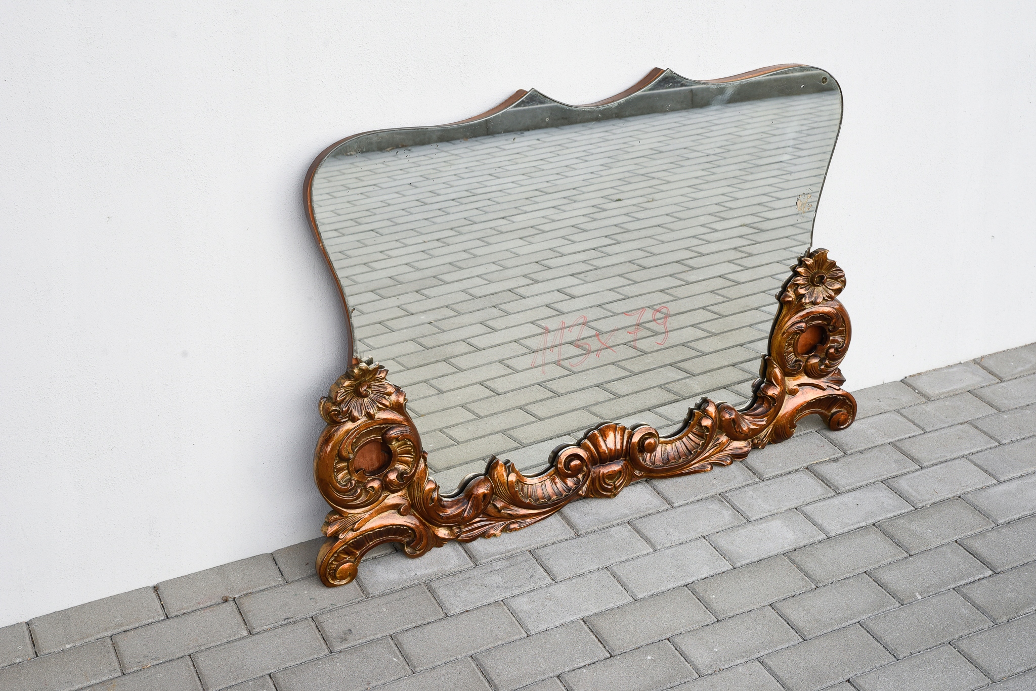 Wyjątkowe lustro wykonane zostało w pierwszej połowie XX wieku. Ręcznie rzeźbione, oryginalna fazowana, szyba, pięknie zdobione.