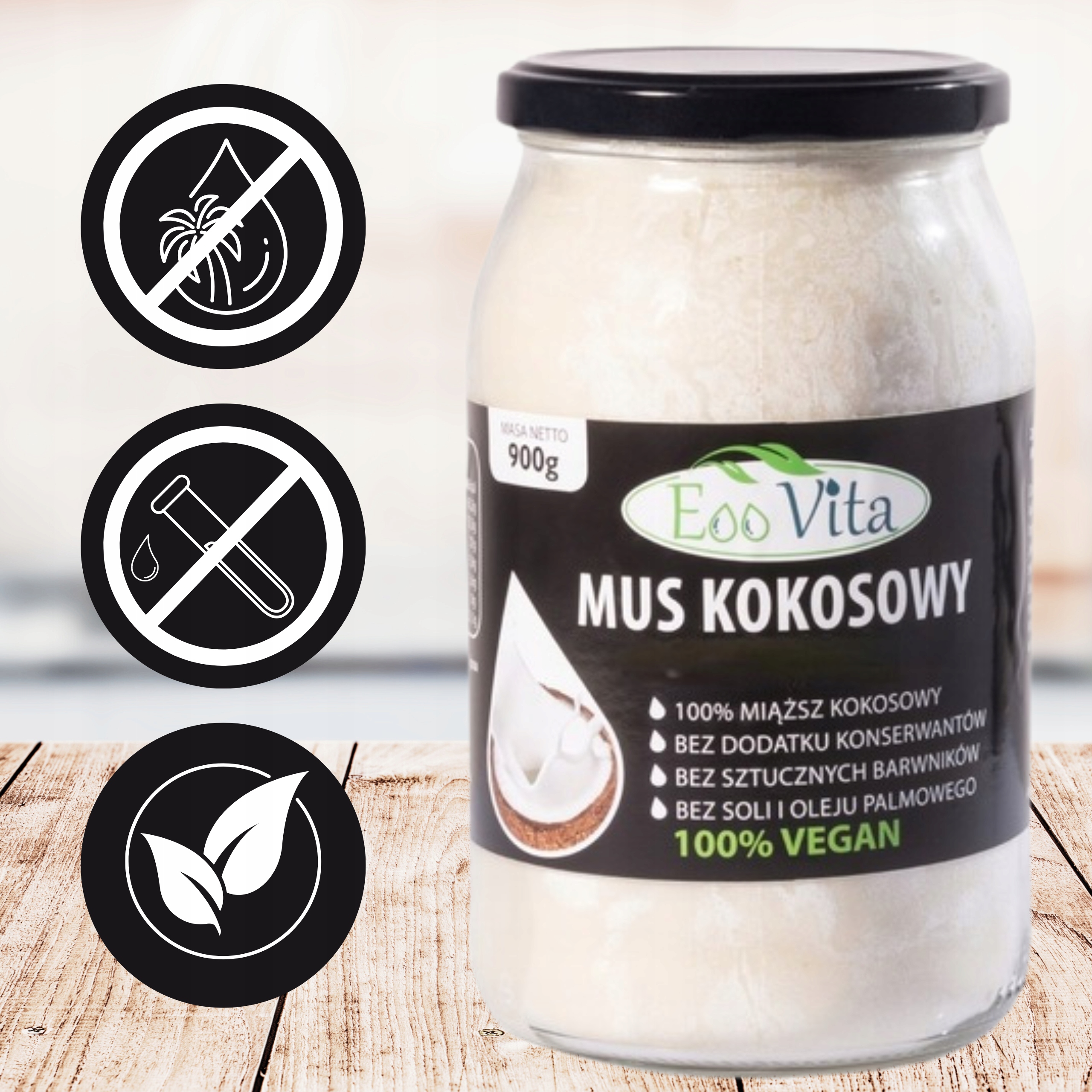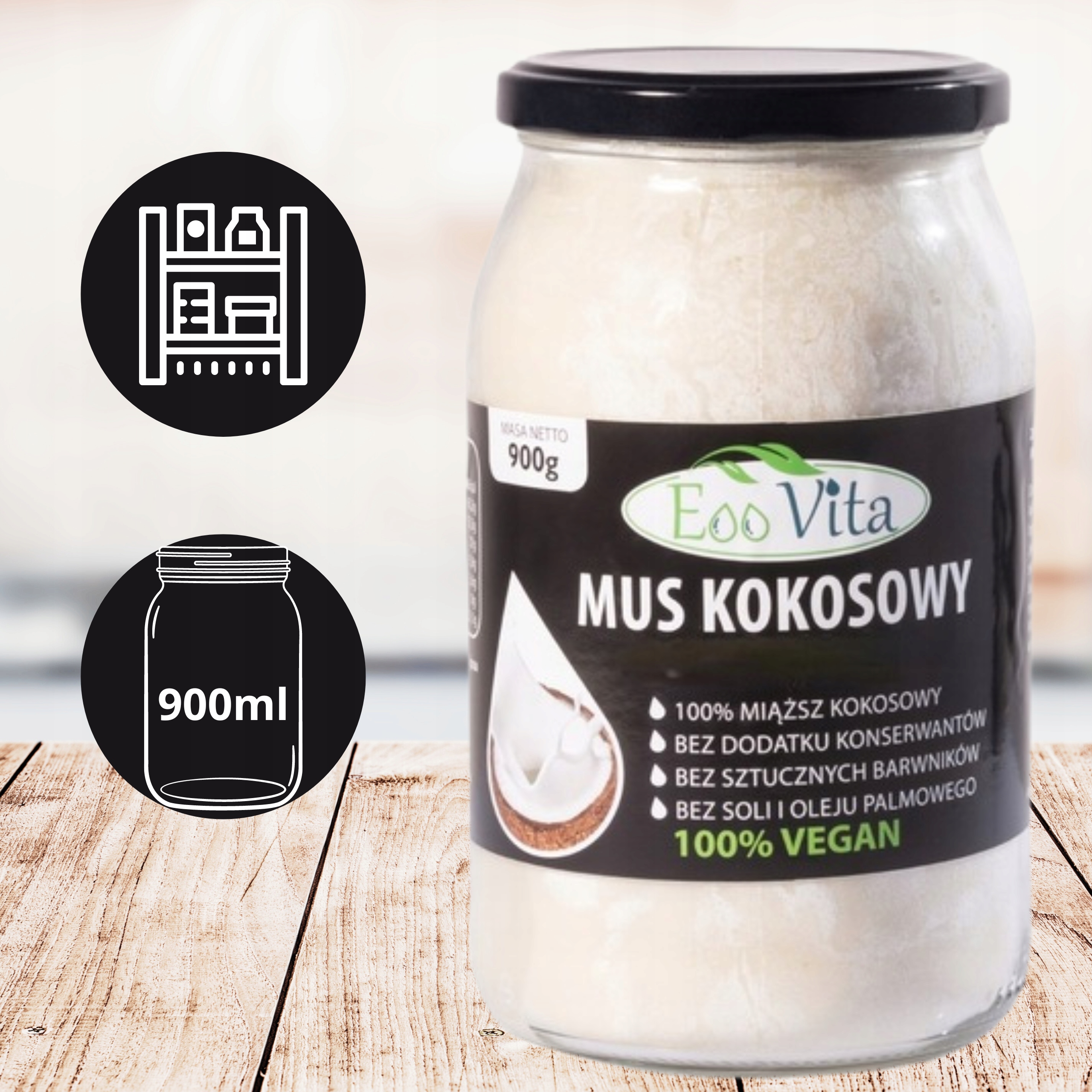 Naturalny mus kokosowy który często nazywany jest też pastą kokosową lub masłem kokosowym. Wytwarzany poprzez zmielenie miąższu kokosa.. W przeciwieństwie do oleju kokosowego ma konsystencje bardziej zwartą oraz wyczuwalny, kokosowy zapach. Idealnie komponuje się do ciepłych dań np. racuchów, naleśników, omletów, ciast czy batonów. W wyższej temperaturze przyjmuje postać gęstego kremu.