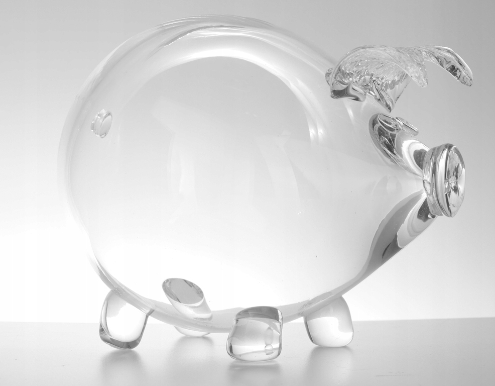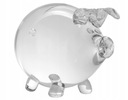 Świnka skarbonka. Wykonana z grubego szkła świetnie się prezentująca, bezbarwna i błyszcząca powierzchnia szkła. Produkt polski. Świnka ma otwór - szczelinę na górze do wrzucania pieniążków. Jedynym sposobem na wyciągnięcie drobnych jest rozbicie.