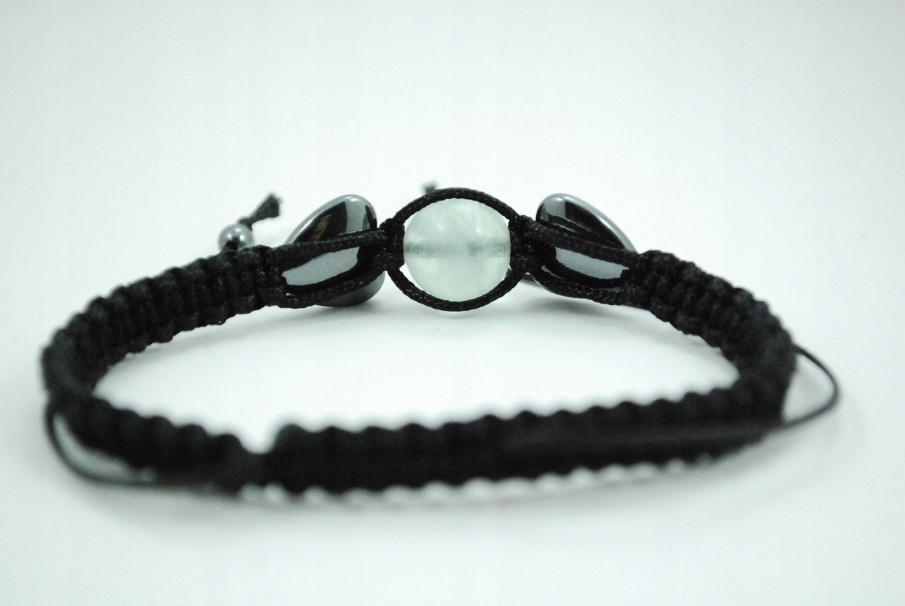 Bransoletka przystrojona jest naturalnymi kamieniami fluorytu. Fluoryt uspokaja, łagodzi emocje, stres, depresję i pozwala osiągnąć spokój ducha.
