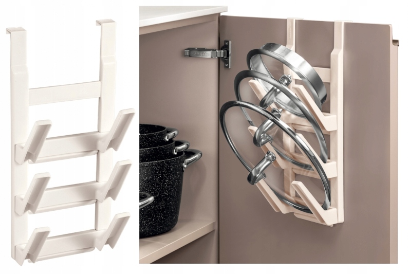 Doskonały do przechowywania pokrywek i oszczędzania miejsca. Uchwyt należy zawiesić po wewnętrznej lub zewnętrznej stronie drzwiczek w szafkach kuchennych, położenie uchwytów w części wiszącej można ustawić według własnych potrzeb.