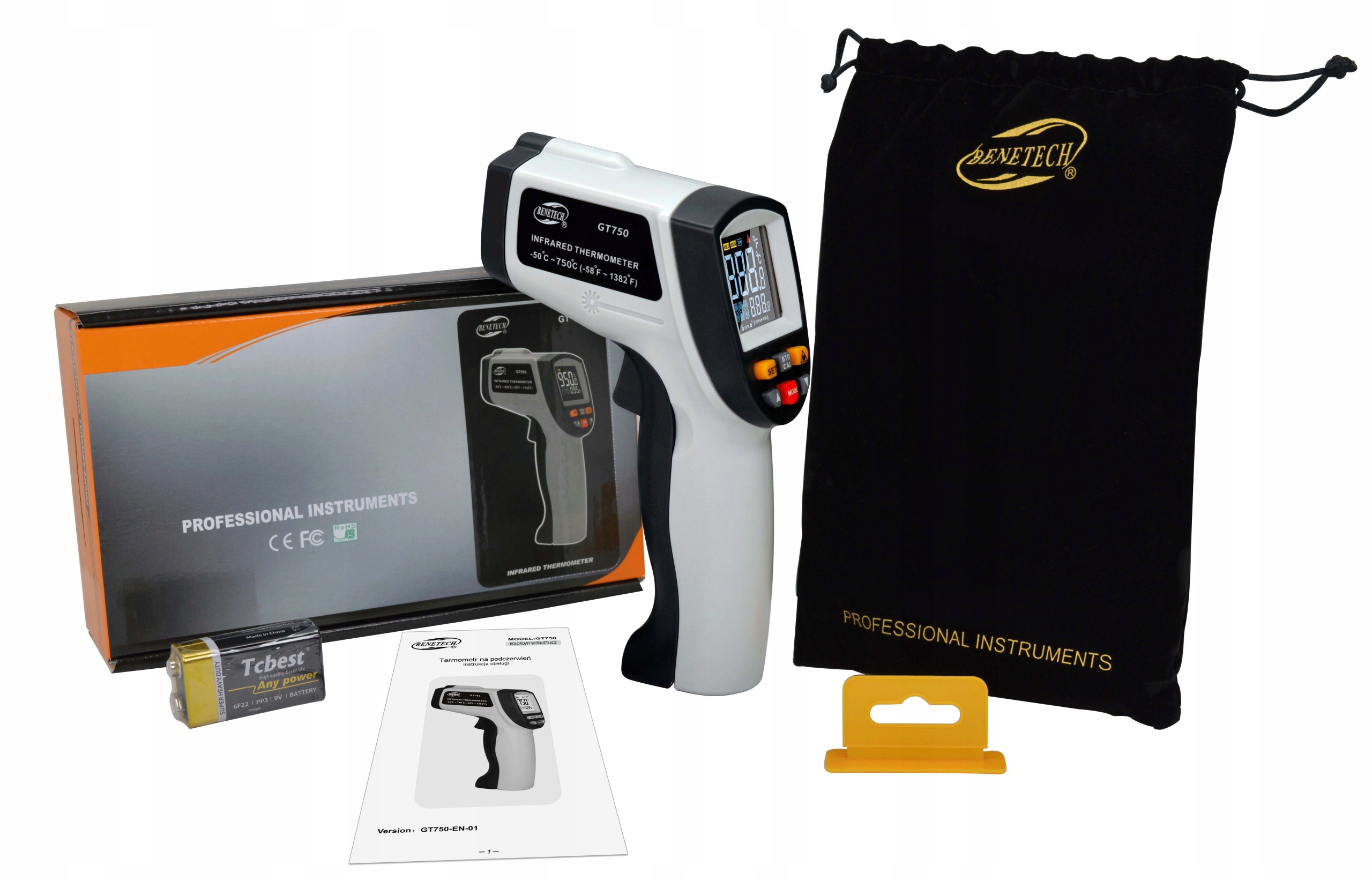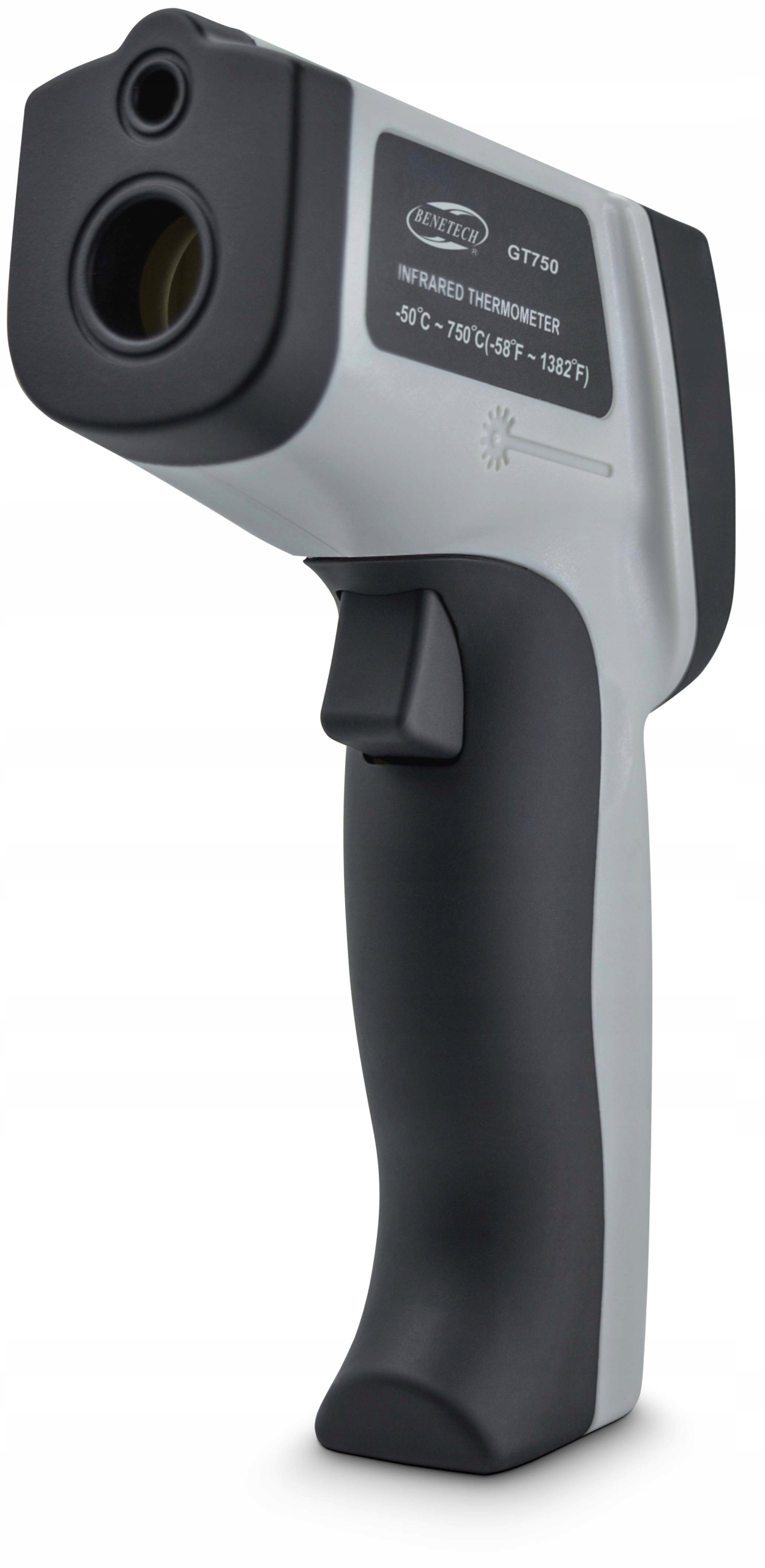 Wysokiej jakości termometr bezkontaktowy marki Benetech o zakresie temperatur od -50 do +750 °C. Urządzenie wyposażone jest w celownik laserowy, który umożliwia precyzyjne nacelowanie badanego punktu. W urządzeniu zastosowano dobrej jakości materiały, a ergonomiczna budowa poprawia wygodę użytkowania termometru. Podświetlany KOLOROWY wyświetlacz umożliwia pracę z urządzeniem w ciemności. Pirometr wyposażony jest w funkcję automatycznego wyłączenia zwiększając oszczędność w zużyciu baterii.