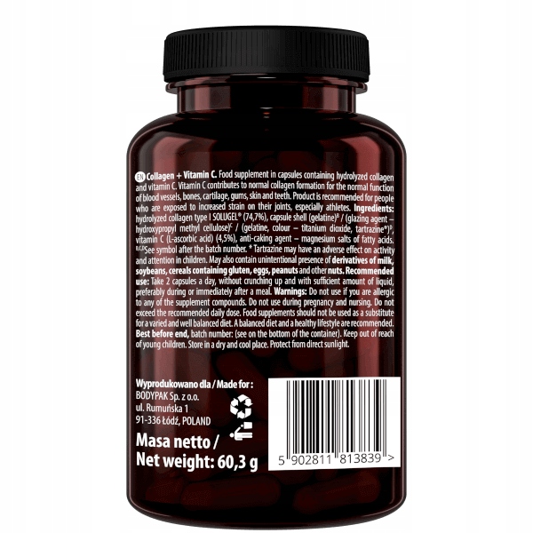 Składniki: hydrolizat kolagenu typu I SOLUGEL® (74,7 %), otoczka kapsułki (żelatyna)B / (substancja glazurująca - hydroksypropylometyloceluloza)C / (żelatyna, barwnik - dwutlenek tytanu, tartrazyna*)D, witamina C [kwas L-askorbinowy (4,5 %)], substancja przeciwzbrylająca (sole magnezowe kwasów tłuszczowych).