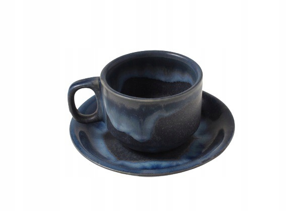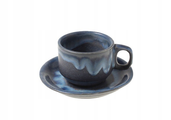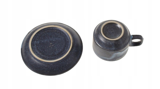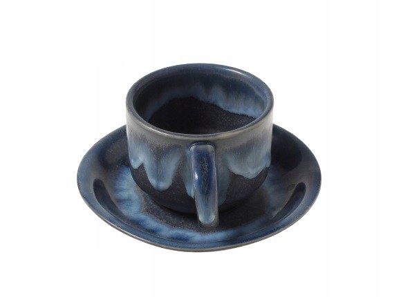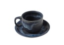 Filiżanka i spodek do mokki. Zestaw wykonano z białej glinki i pomalowano na kolor siwo-niebieski z zaciekami jasnoniebieskiego szkliwa. Datowanie: po 2000r.