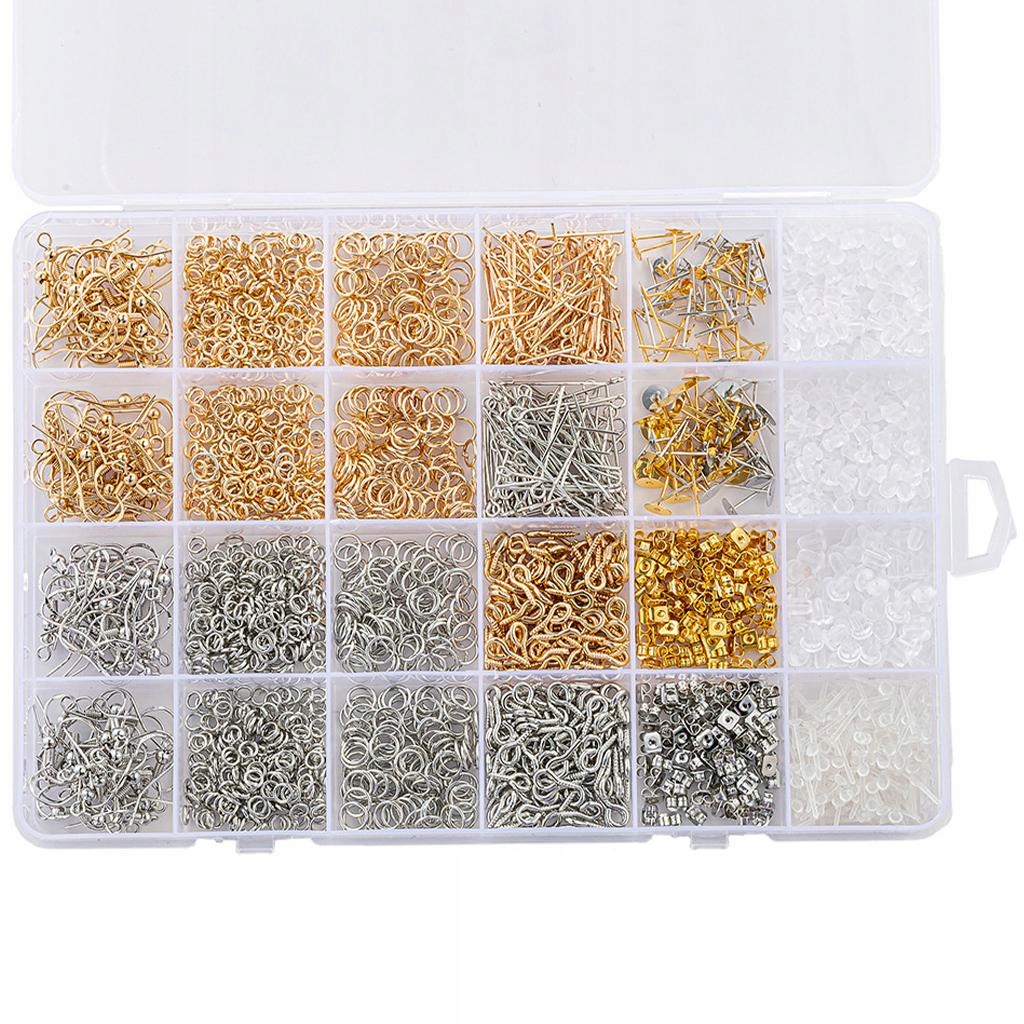 Wszystkie materiały eksploatacyjne do wyrobu kolczyków są starannie i uporządkowane umieszczone niezależnie w 24-komorowym pudełku do przechowywania