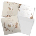 Subtelny wzór złotych stópek na froncie i we wnętrzu sprawia, że zaproszenie jest delikatne i eleganckie.