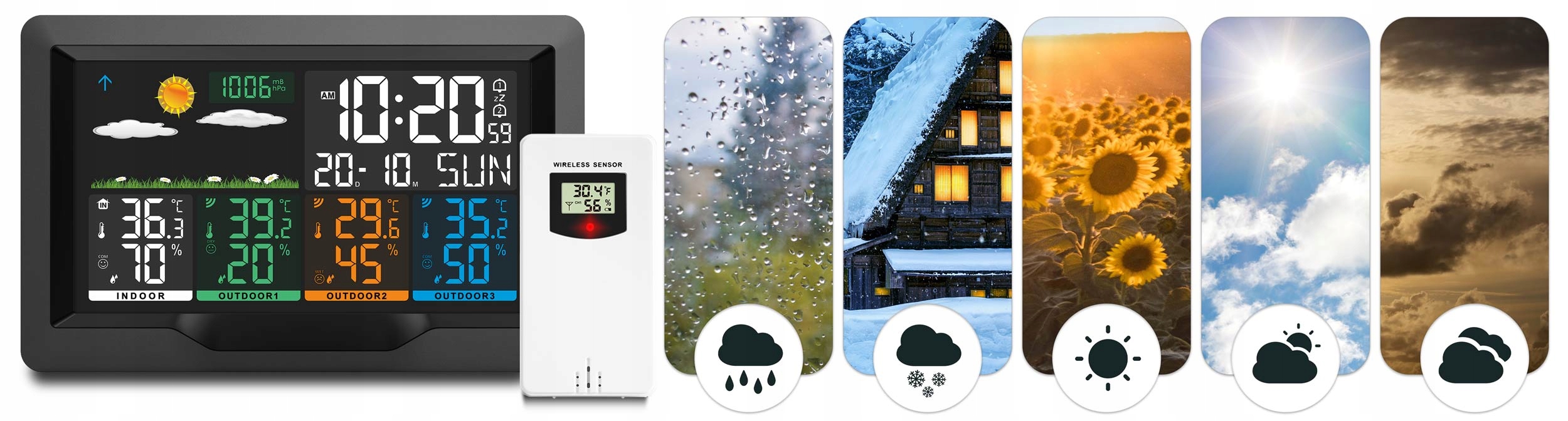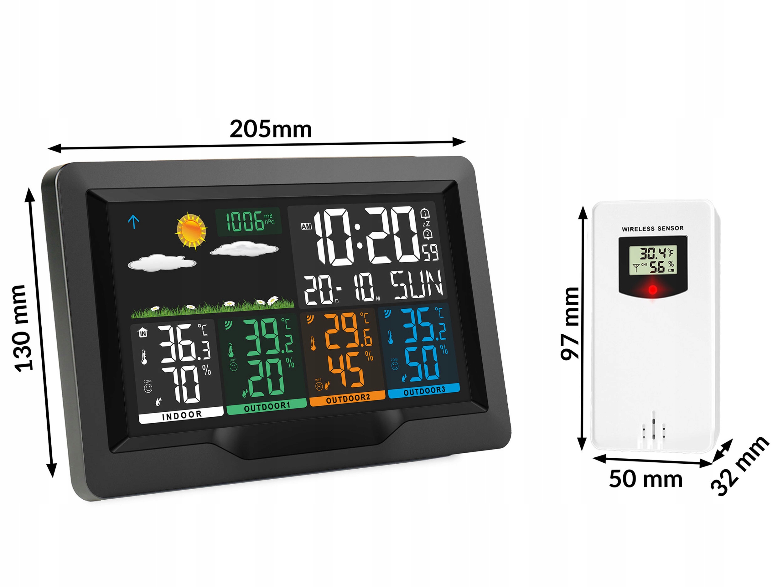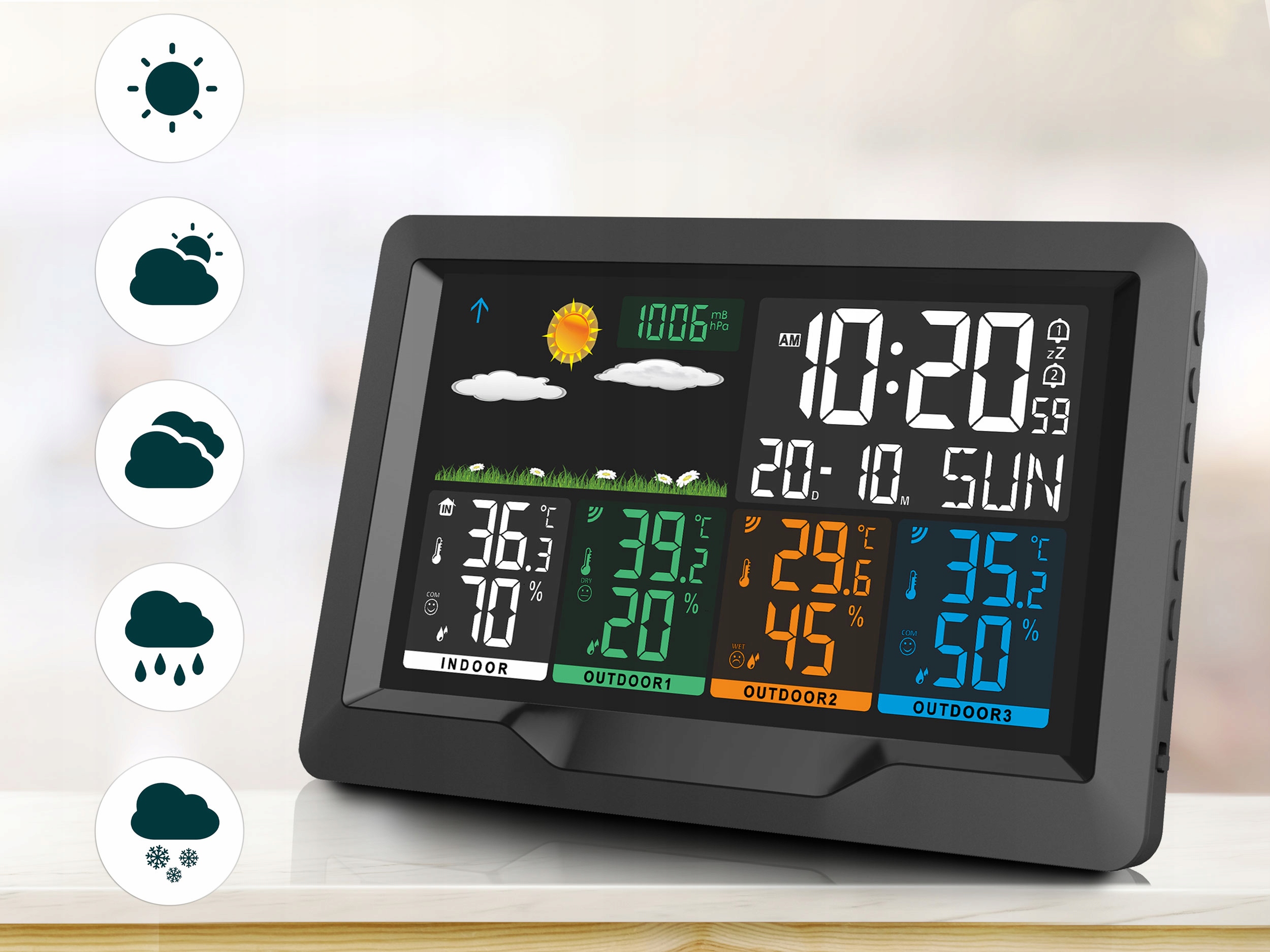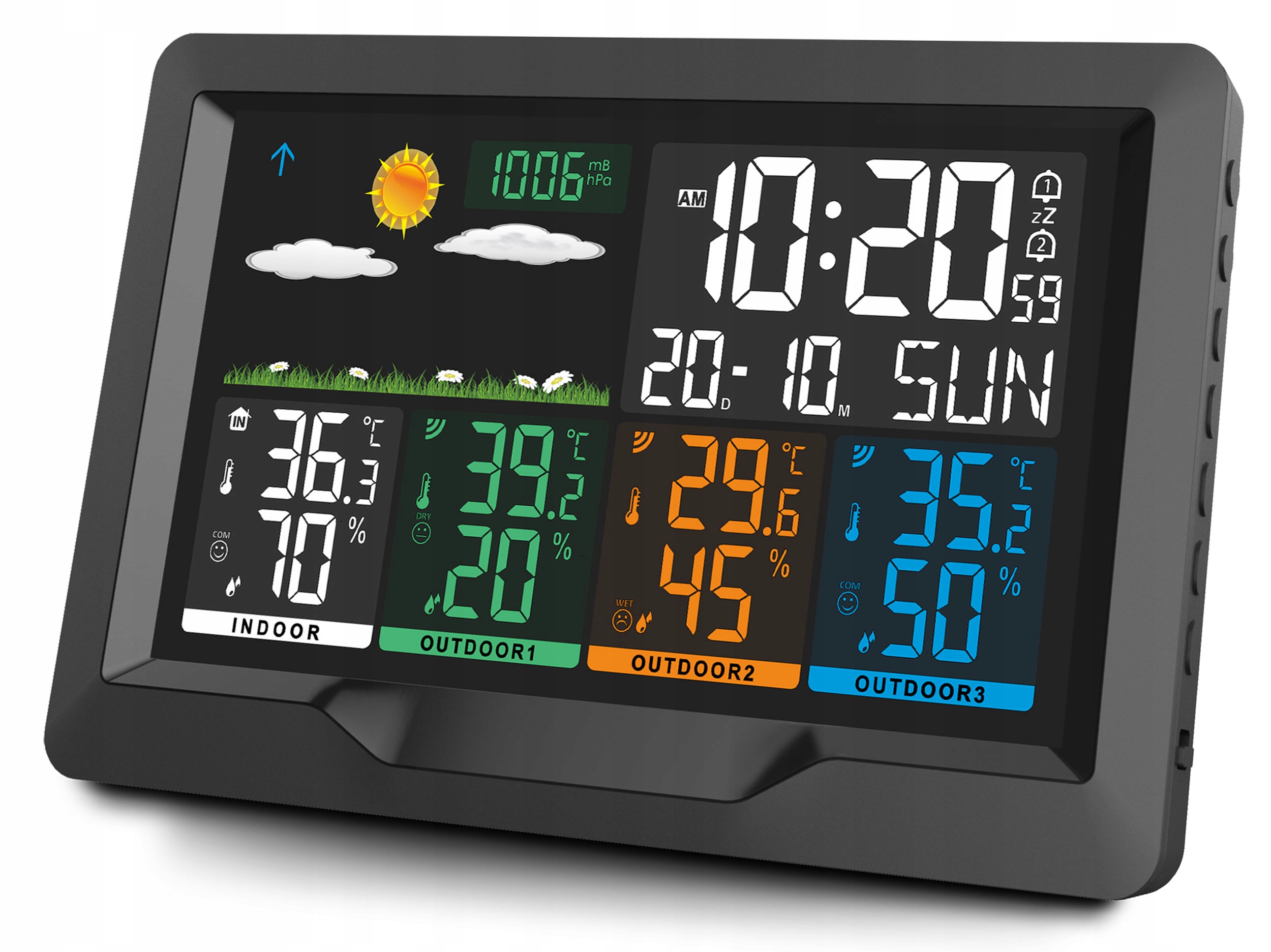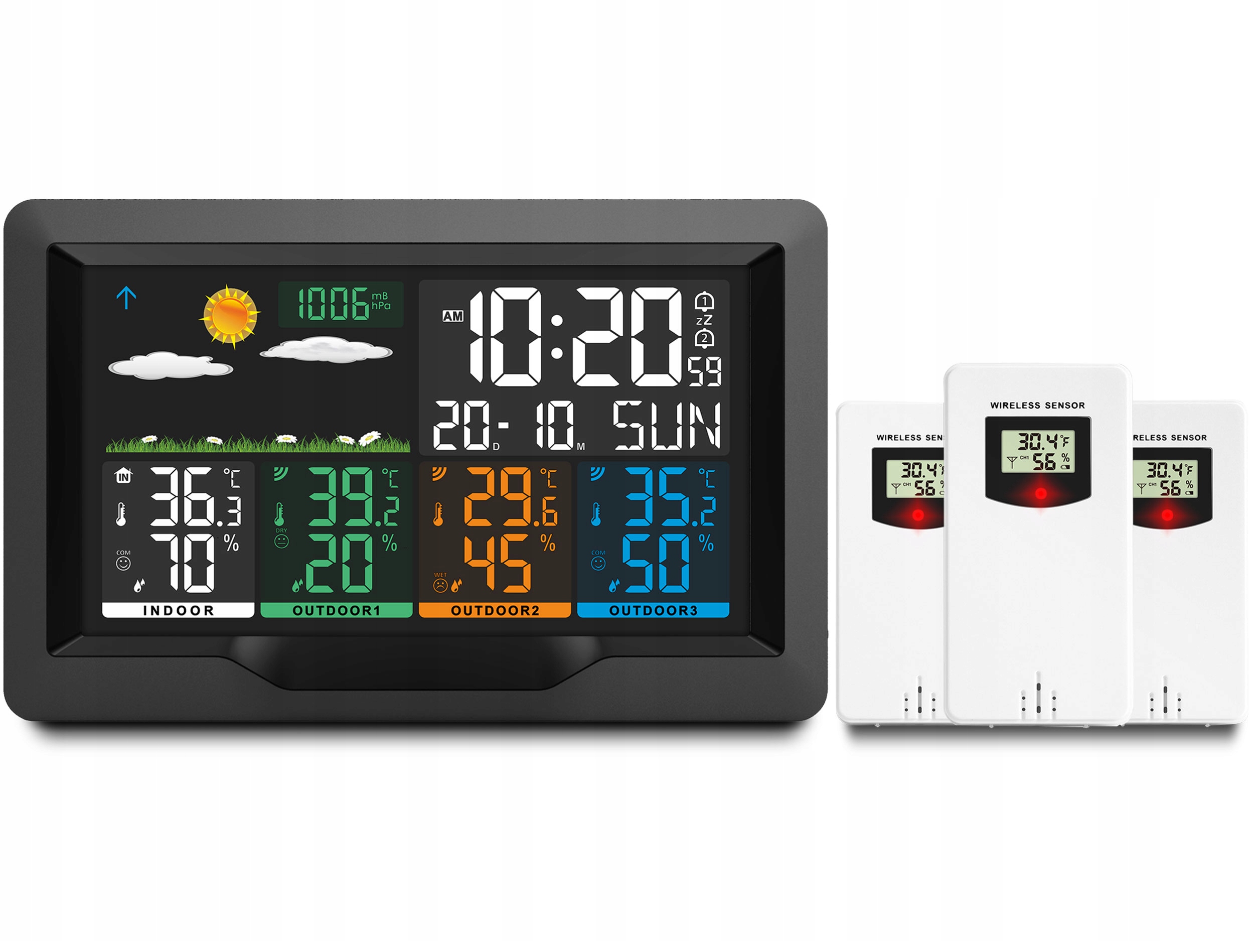 Urządzenie automatycznie synchronizuje się z 3 czujnikami. Jednocześnie wskazuje pomiary ze stacji oraz z czujnika, które łatwo odczytasz na kolorowym wyświetlaczu.