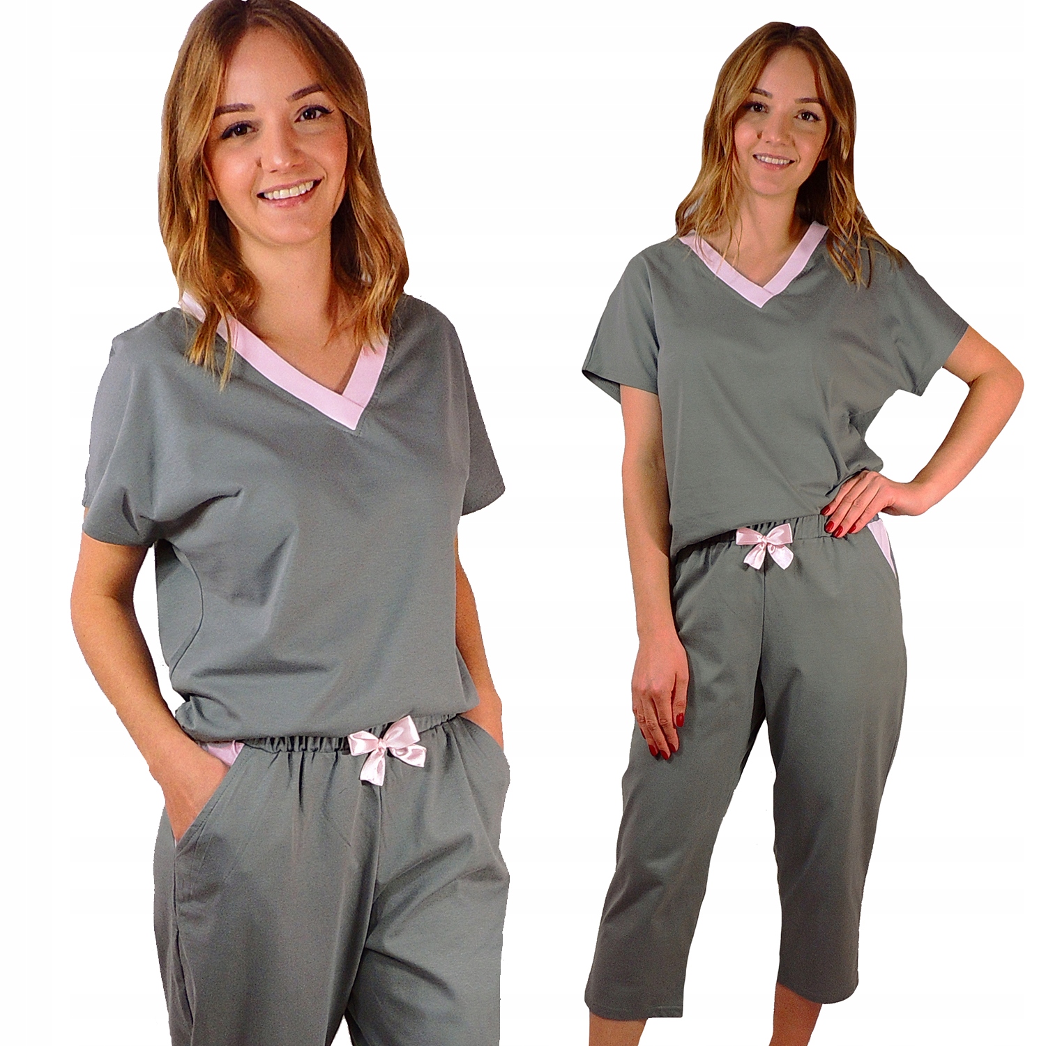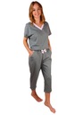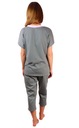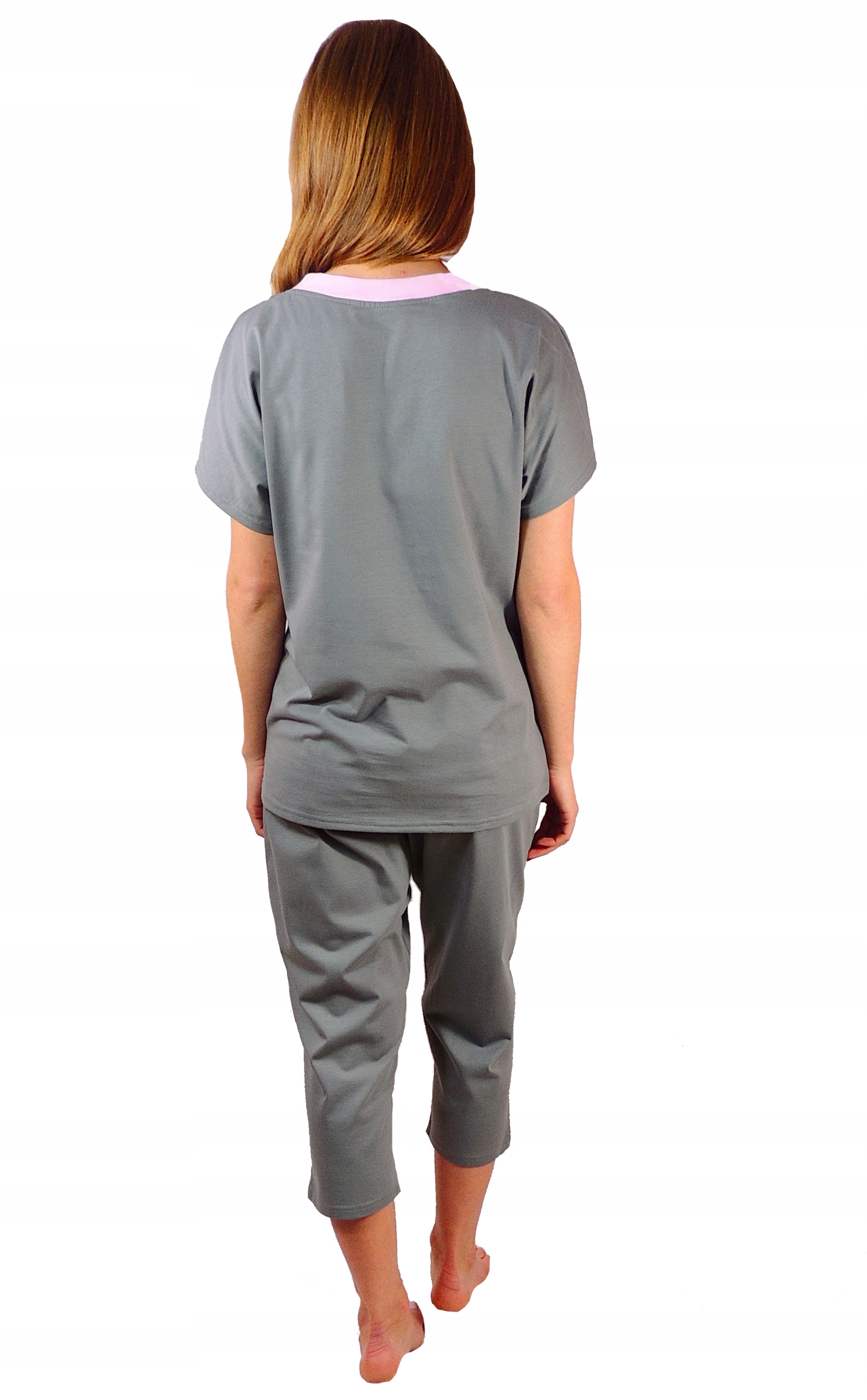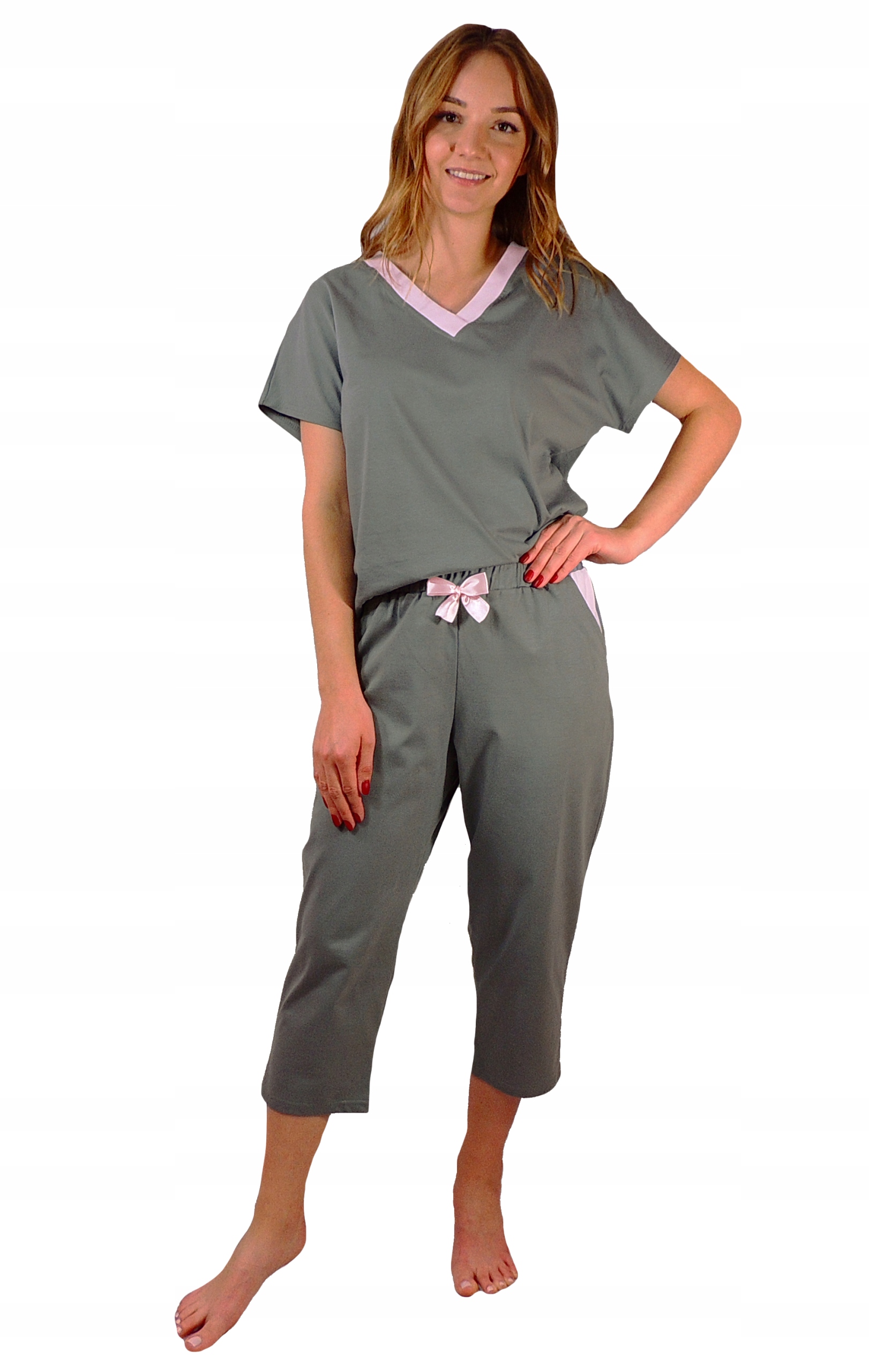 Piżama 3/4 szara. Koszulka posiada jasno różowy dekolt w V, a spodnie ozdobną kokardkę i dwie kieszenie z jasno różowym wnętrzem. Przyjazny dla skóry materiał piżamy to wyjątkowo przyjemna w dotyku bawełna. Całość idealnie dopasowuje się do ciała, zapewniając wysoki komfort noszenia w dzień oraz podczas snu. Luźne (typu kimono), krótkie rękawki pozwalają na swobodę w codziennym użytkowaniu.