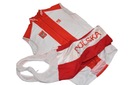 Do sprzedania komplet POLSKA. Stan BDB. Spodenki, rozmiar: M. Dł. 86 cm, szer. w pasie: 35 cm, dł. nogawki od kroku: 25 cm. Koszulka, rozmiar: 5, dł. 67 - 75 cm, szer. pod pachami: 54 cm, szer. na dole: 43 cm. Zapraszam...
