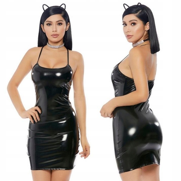 Piękna vinylowa sukienka damska. Idealnie układa się na ciele kobiety pokazując jej wszystkie walory. Bielizna damska, która nadaje kobiecemu ciału seksapilu. Seksowna bielizna dla dorosłych, Lateks, Vinyl, Latex, WETLOOK. Czarny komplet. Jest to doskonały pomysł na prezent. Sukienka Mini.