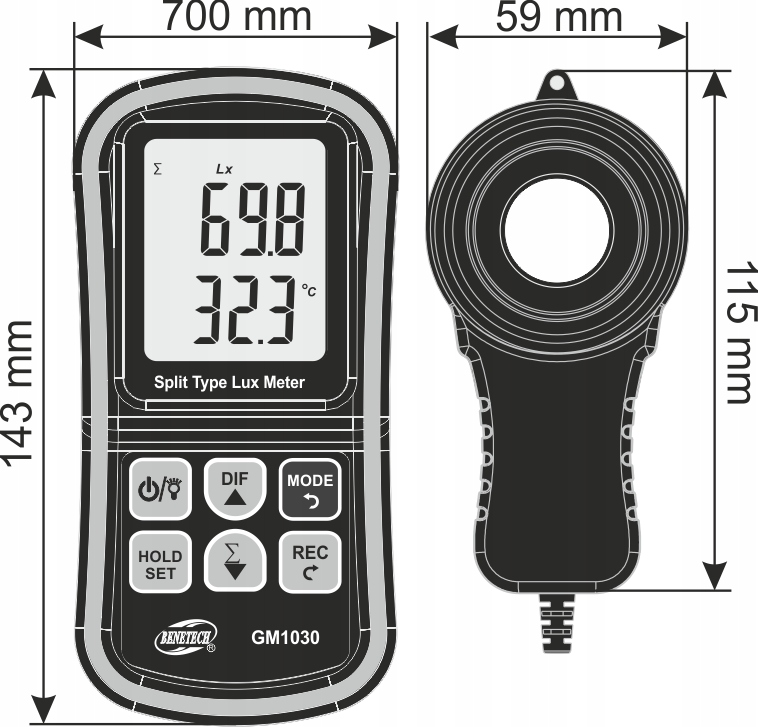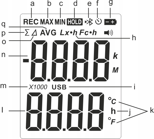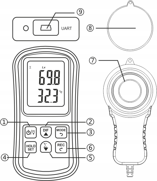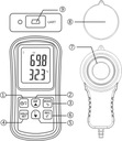 Urządzenie służy do pomiaru wartości natężenia oświetlania, posiada funkcje odczytu wartości minimalnej i maksymalnej dla bieżącego pomiaru, wskaźnik temperatury, a także możliwość zatrzymania wartości pomiaru, zapisu danych, odczytu średniej wartości itp.