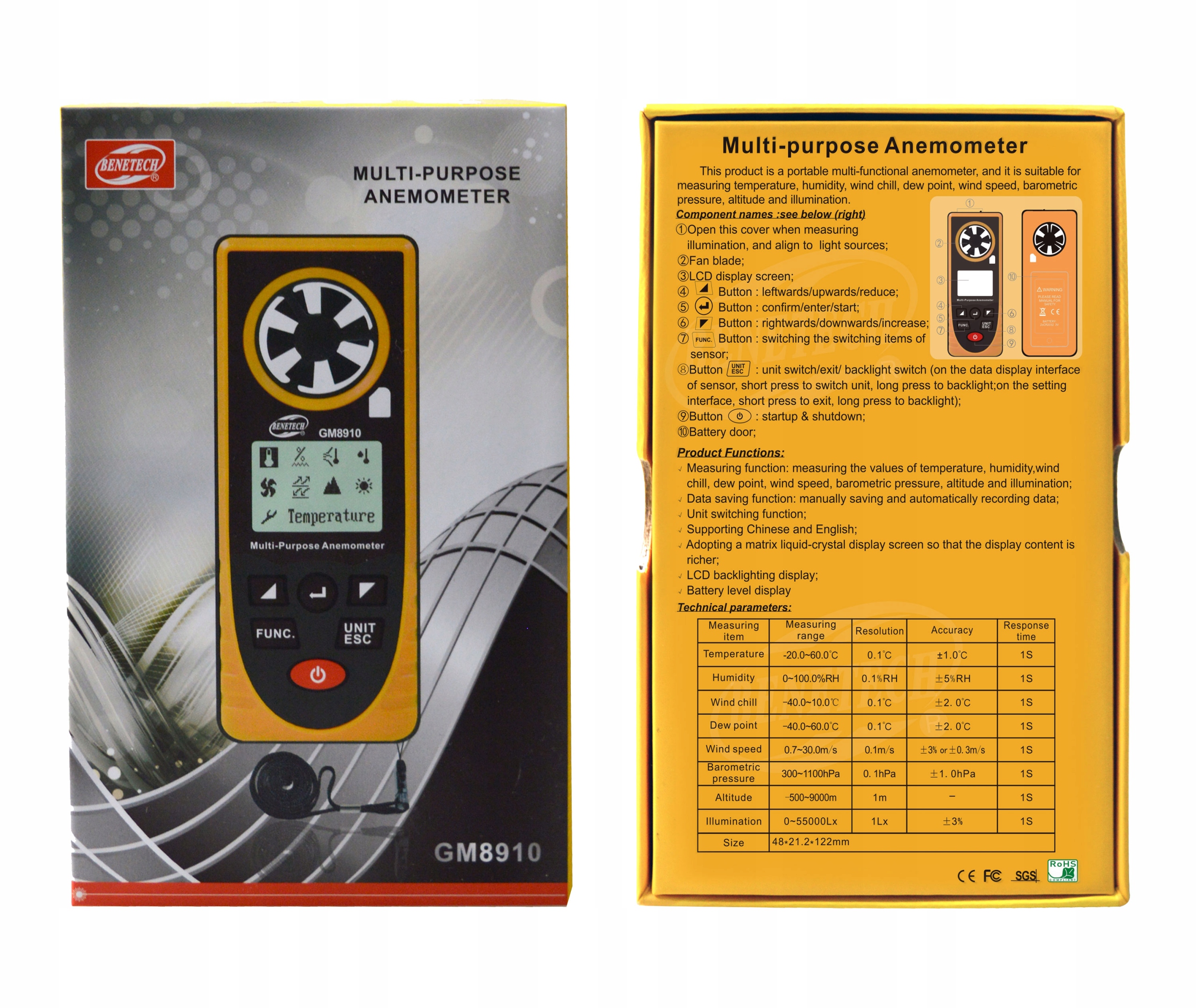 Wielofunkcyjny przyrząd służący do pomiaru temperatury, wilgotności, odczucia chłodu, wiatru, pomiaru punktu rosy, prędkości wiatru, ciśnienia barometrycznego, wysokości i oświetlenia.