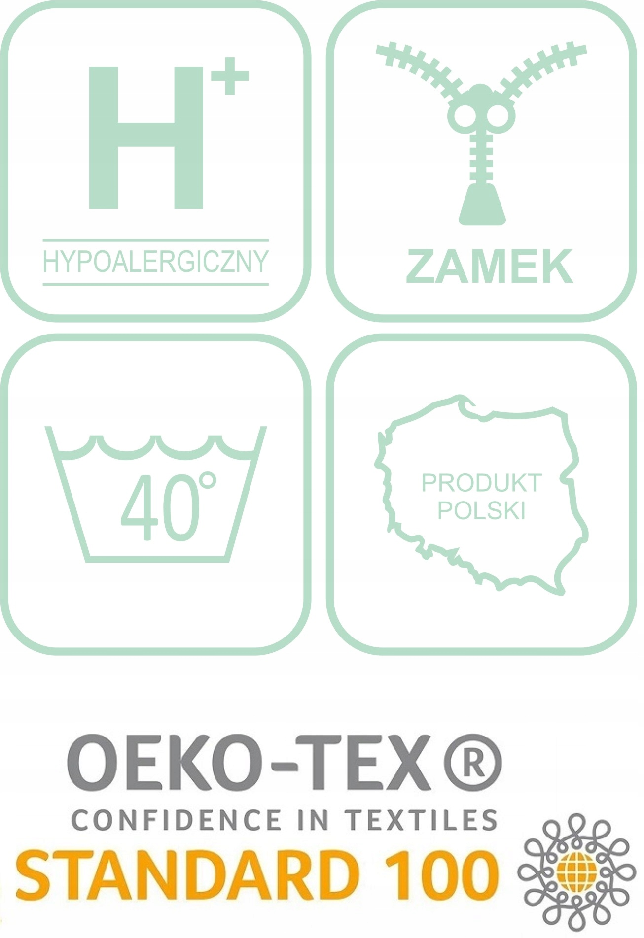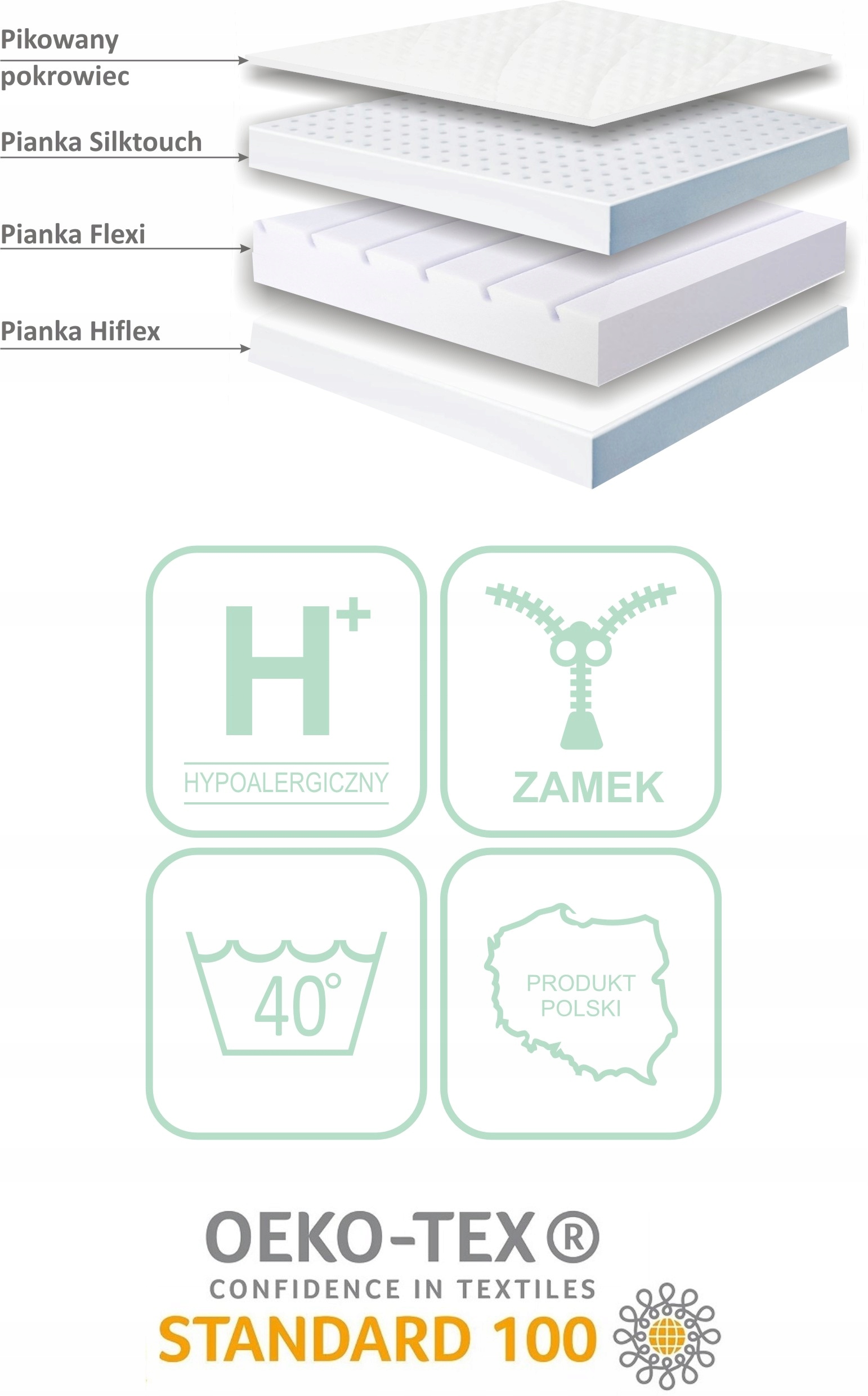 Wysokiej jakości pokrowiec, wykonany z hypoalergicznej dzianiny o gramaturze 230g/m2. Jest delikatna i przez to przyjazna dla skóry, szczególnie wrażliwej, która wymaga wyjątkowego podejścia. Dodatkowo potwierdzone jest, że nie powoduje podrażnień oraz w znacznym stopniu zapobiega powstawaniu i rozwojowi bakterii na skórze. Produkt posiada certyfikat Tekstylia Godne Zaufania “Oeko-Tex standard 100”. Posiada zamek, który umożliwia proste i szybkie założenie bądź zdjęcie pokrowca z materaca. Pokrowiec absolutnie nie traci swoich właściwości w praniu, dlatego zaleca się regularne pranie pokrowca zgodnie ze wskazówkami umieszczonymi na metce.