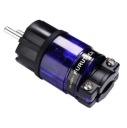 Wtyk zasilający Schuko na przewód. Wszystkie metalowe części wykonano z niemagnetycznych materiałów (brąz, oraz miedzi OCC) powlekanych rodem. Przednia część wtyczki wykonana jest z włókna szklanego, tylna z Polikarbonatu.