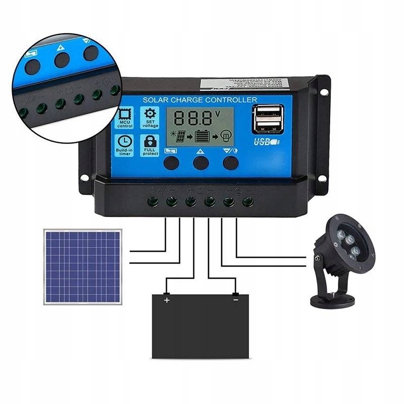 Kontroler przetwarza energię z paneli słonecznych do akumulatora, zabezpieczając przed przeładowaniem oraz nadmiernym rozładowaniem przez sprzęty podłączone do zasilania.