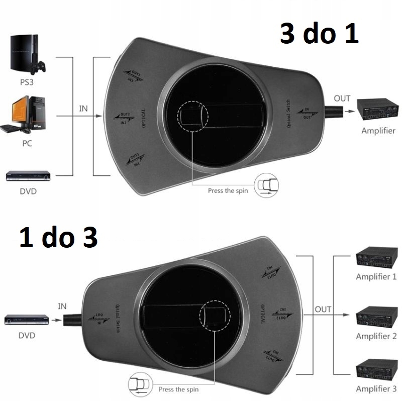 Rozdzielacz Switch Toslink może być wykorzystana na dwa sposoby, z 3 gniazd optycznych na 1 lub z 1 gniazda optycznego na 3. Switch umożliwia wykorzystanie jednego gniazda optycznego Toslink w amplitunerze lub wzmacniaczu do podłączenia trzech źródeł sygnału. Dzięki temu nie trzeba przełączać co chwilę kabli, by wykorzystać wysoką jakość połączenia optycznego. Możliwe jest podłączenie telewizora, komputera oraz konsoli do gier w jednym momencie. Za pomocą przełącznika na rozdzielaczu wybiera się źródło sygnału. Umożliwia też podłączenie jednego urządzenia, które będzie przesyłało sygnał optyczny do switcha i wybranie jednego z trzech sprzętów na które ma być przesłany sygnał za pomocą pokrętła. W prosty sposób można wybierać pomiędzy sprzętem grającym oraz pomieszczeniami w których ma być odtwarzany dźwięk. Nie wymaga dodatkowego zasilania.