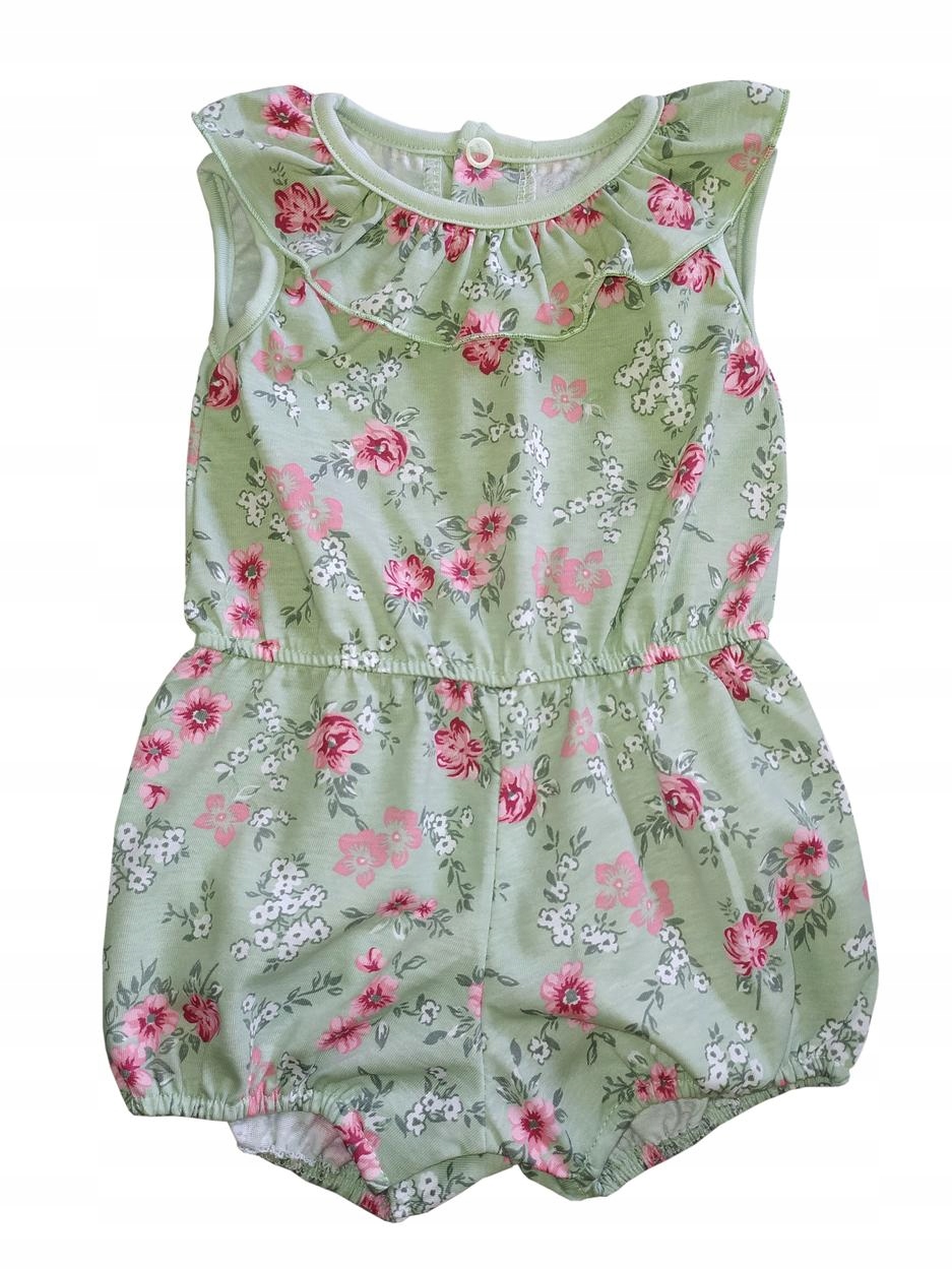 Rampers w kolorze zielonym w drobne kwiatuszki. Pod szyjką ozdobny kołnierzyk. Zapięcie na pleckach i w kroku na bezniklowe napki daje komfort i bezpieczeństwo dziecka, zarówno podczas ubierania, zabawy czy snu.