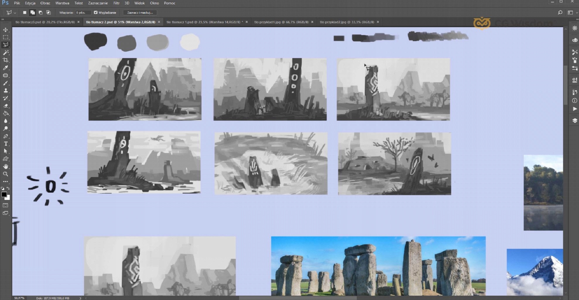 Kurs zaczyna się od wstępu dotyczącego Digital Artu samego w sobie - wspólnie przejdziemy tutaj przez wszystkie popularne branże zatrudniające cyfrowych artystów. Wstęp zawiera też cenne porady dotyczące przygotowania wygodnego stanowiska pracy, zebrania materiałów do nauki rysunków a także trochę motywacji dla każdego początkującego :-)