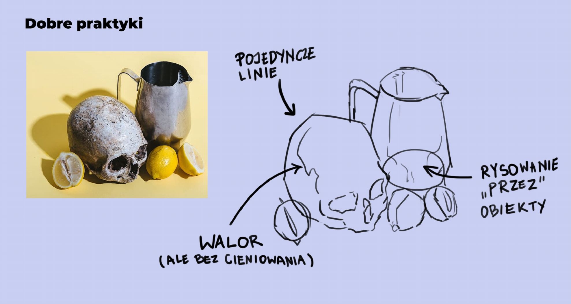 Cała podstawowa wiedza została rozbita na łatwe do przyswojenia części, jak prawidłowe techniki rysowania, walor czy teoria koloru. Oprócz teorii kurs pokazuje również, jak użyć nowej wiedzy w praktyce - kursant zobaczyć może kompletny proces tworzenia studium oraz ilustracji wraz z komentarzem objaśniającym dokładnie każdy etap i użyte techniki.