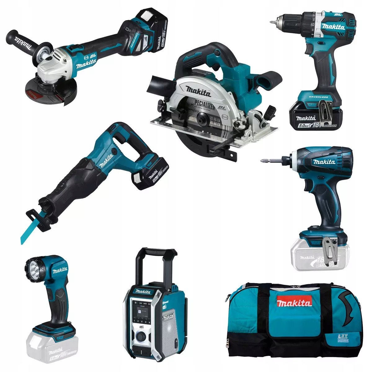 Kompleksowy zestaw narzędzi akumulatorowych 18 V LXT do użytku profesjonalnego. Zawiera wiertarko-wkrętarkę DDF484 o maksymalnym momencie obrotowym 54/30 Nm. W zestawie szlifierka kątowa DGA513 z silnikiem bezszczotkowym i regulacją obrotów oraz lampa DEADML815, piła tarczowa DHS661, piła szablasta DJR186, klucz udarowy DTD146 i radio DMR115.